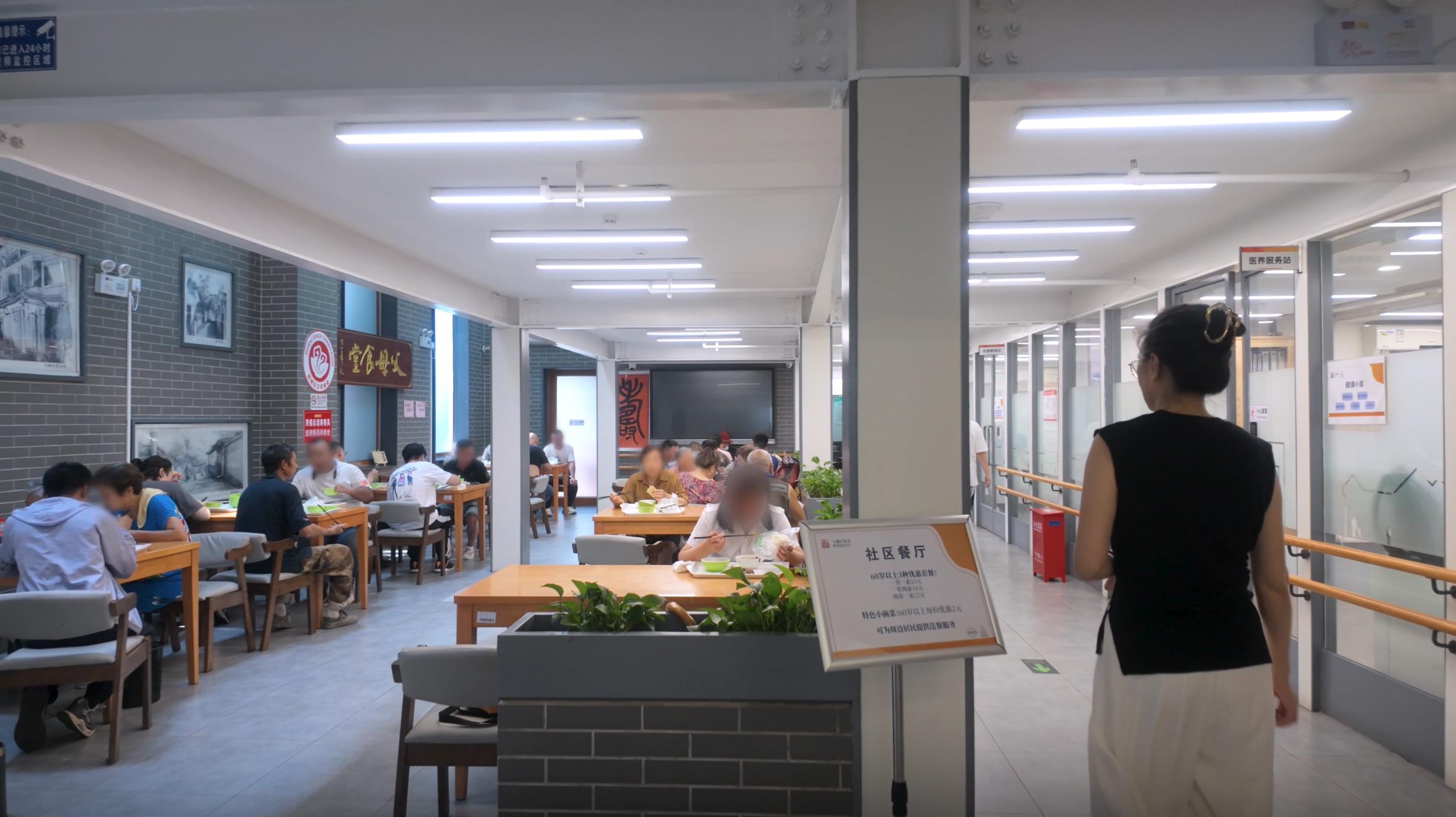 银鹤苑整个建筑实际上是街道养老服务中心,社区食堂占据一层大部分空间,取餐与就餐区分离,互不干扰。
