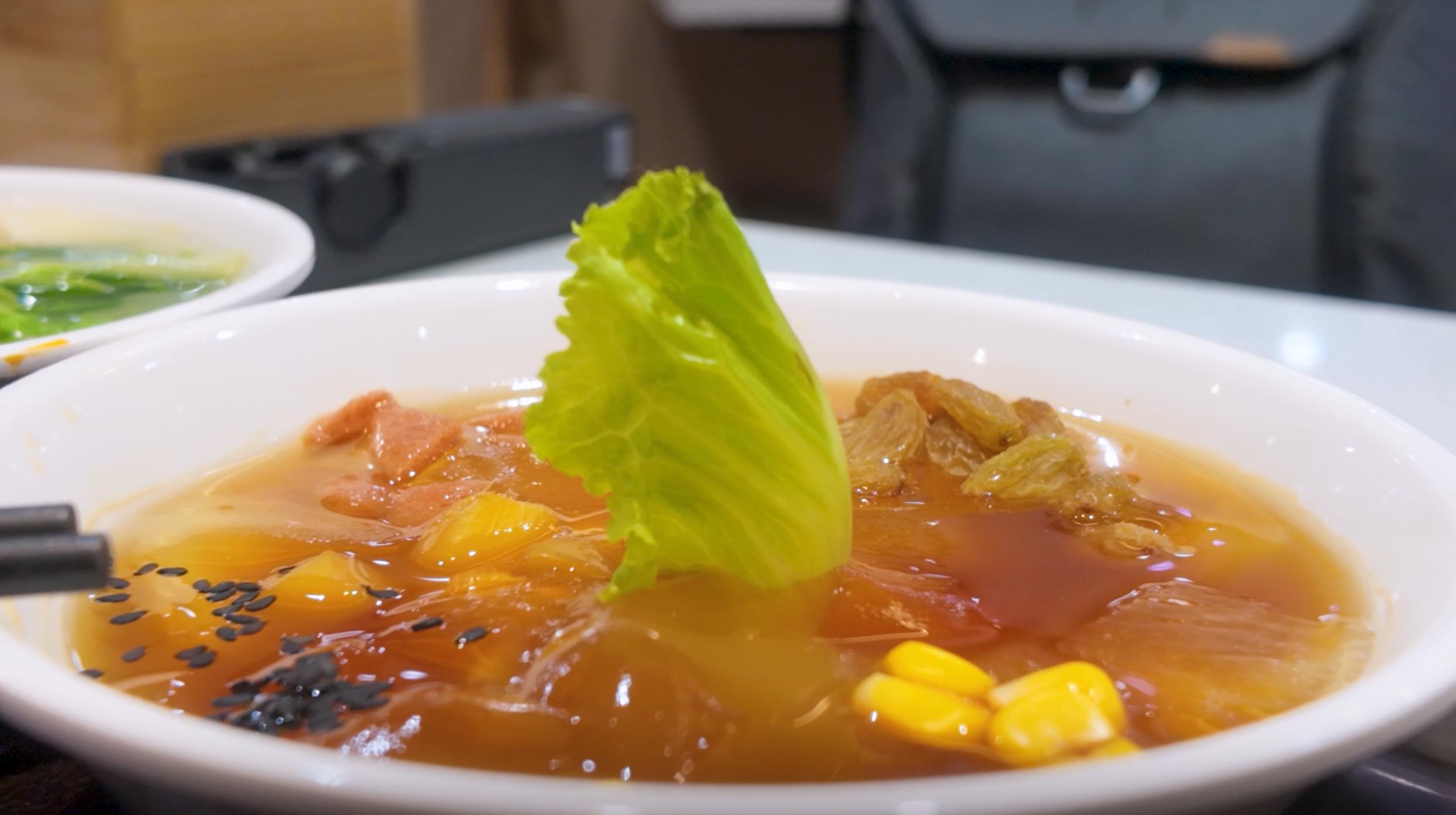 小江和我一致表示这顿饭最满意的是冰粉。虽然碗装的冰粉混搭了生菜、玉米,看上去略显奇葩,但口味清甜,应该是在制作时添加了梨汁。微凉的温度消夏解腻,伴着葡萄干和红糖水一起,别有一番风味。