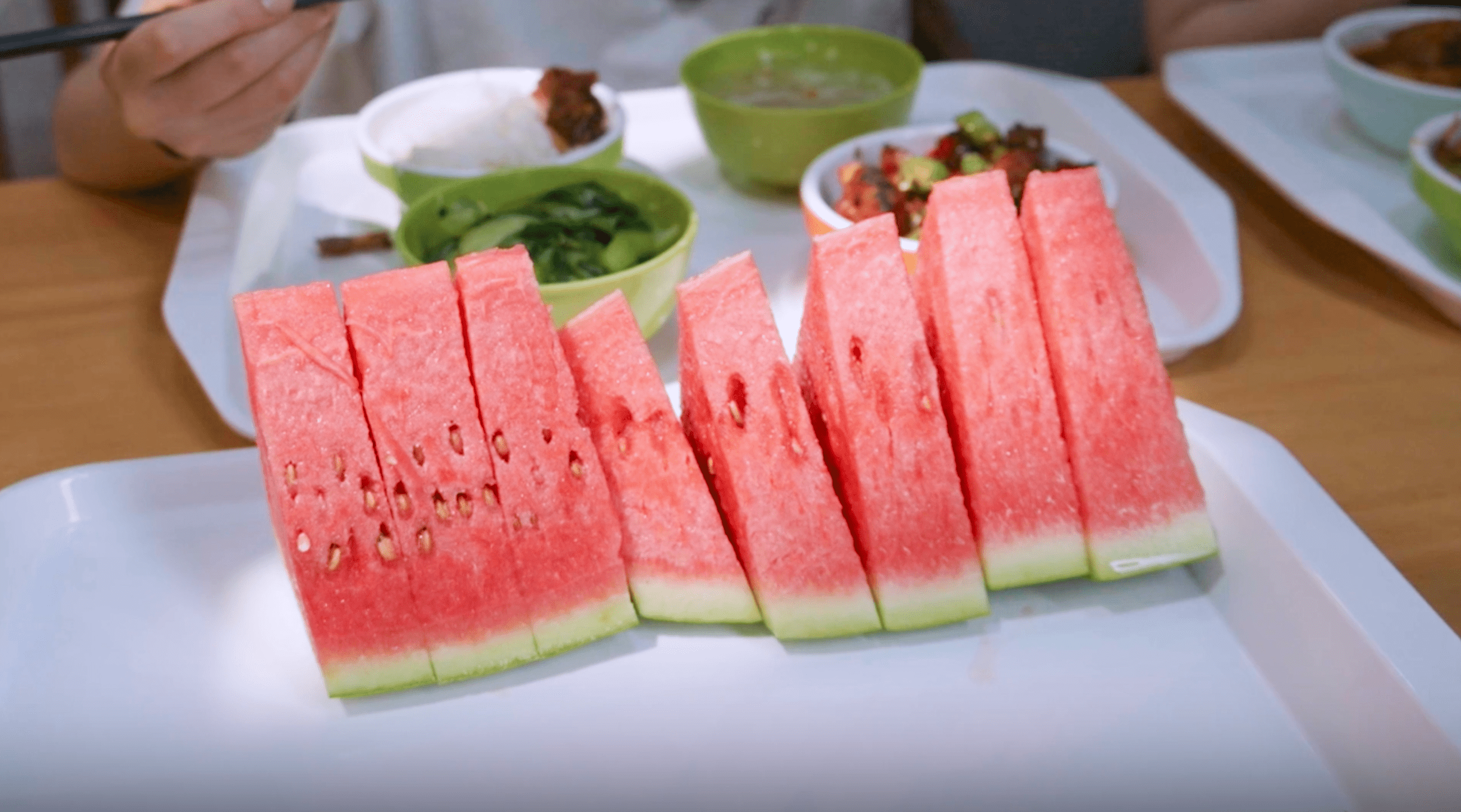 正午天气炎热,热心的食堂阿姨给我们送了一大盘西瓜,凉爽解暑,拯救了快被热晕的我们。