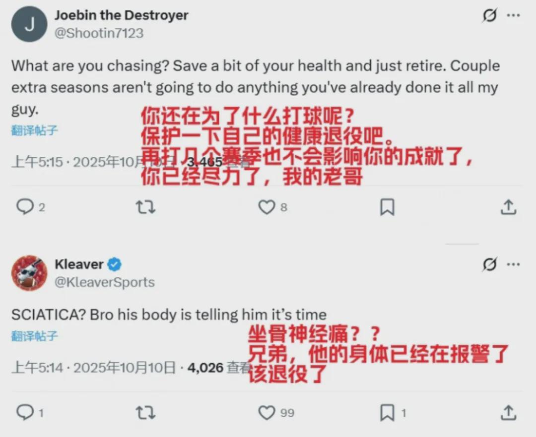 基本上都是觉得詹姆斯可以退役,但也不乏嘲讽。