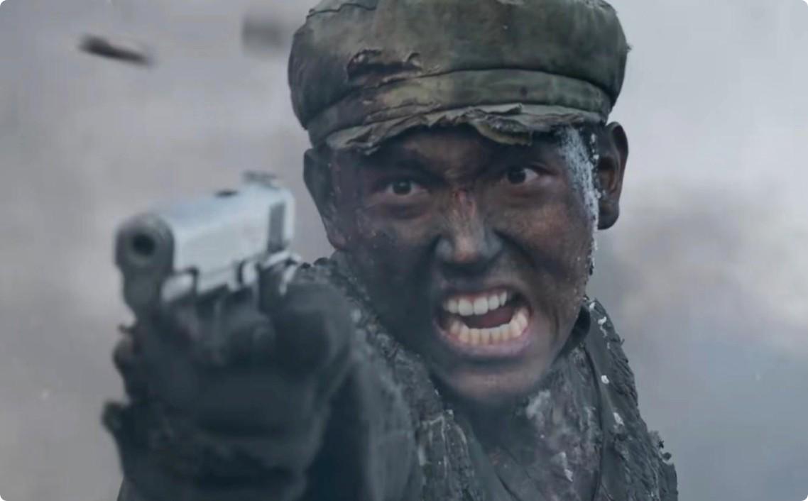 观众感受不到血性,只看到一个“努力装硬汉”的少年。更尴尬的是,他的形象太“干净”,精致的五官、光滑的皮肤、整齐的发型,让他在泥泞的战场上显得格格不入。