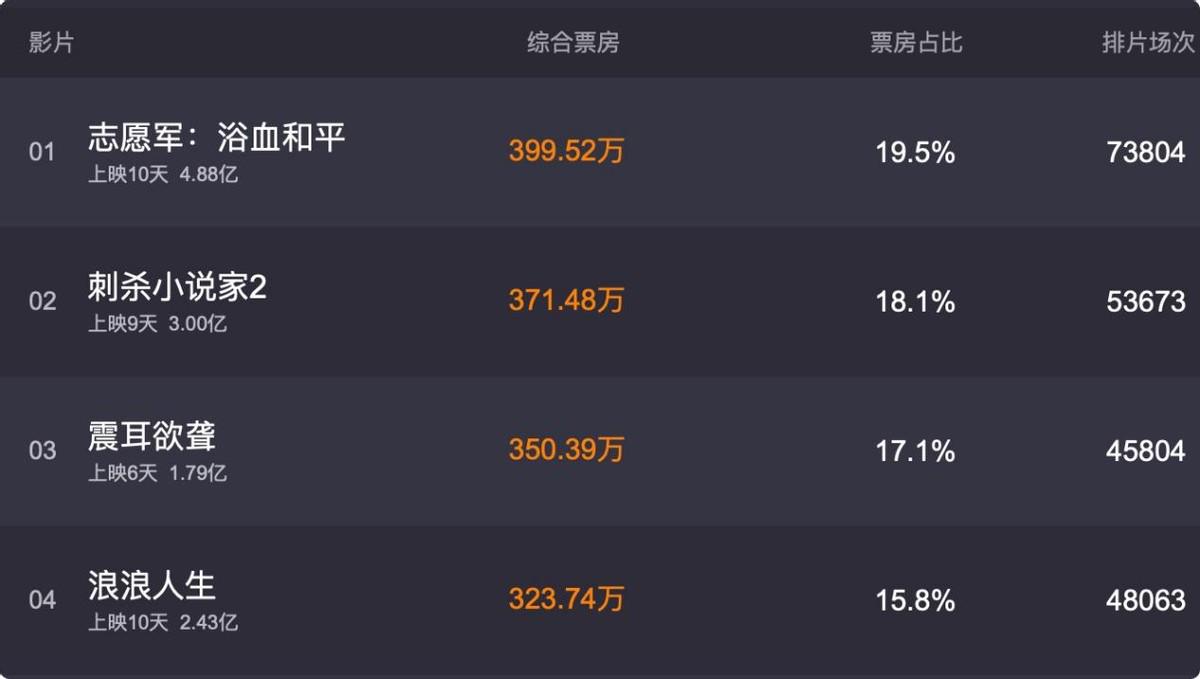 上映10天票房刚过四亿,成为档期冠军,却远不及《长津湖》系列的票房体量和观众口碑。