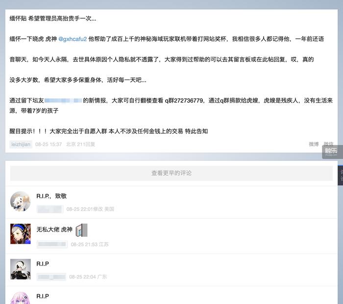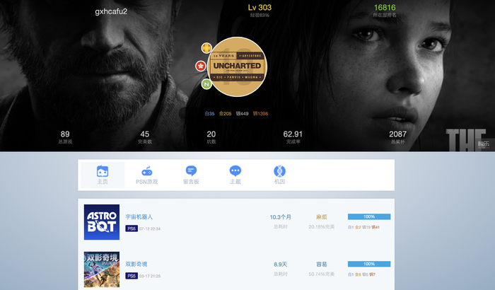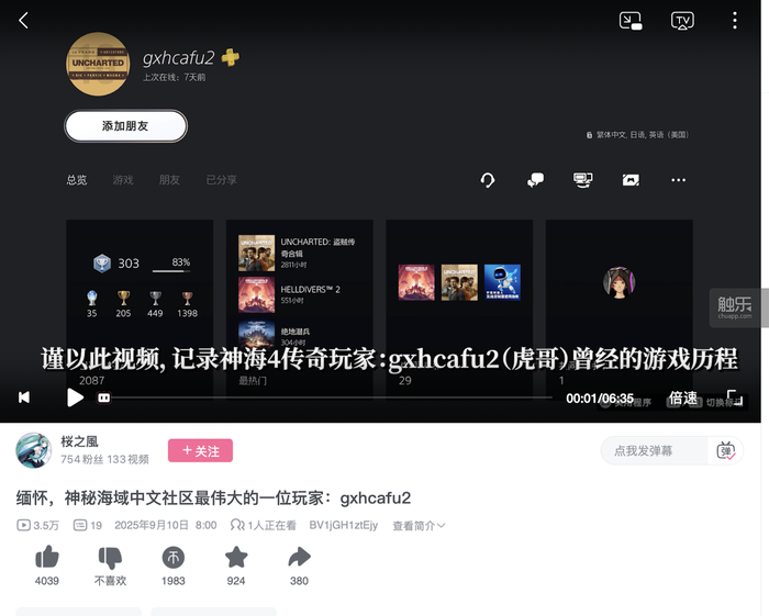 也是在这一天,奖杯网站PSNINE(一般被称作“P9”或“奖杯站”)上出现了一则缅怀帖,帖子的内容是缅怀“虎哥”“虎神”以及“晓虎”,这3个称呼都指向一个ID为“gxhcafu2”的玩家,也就是郭晓虎。在这一边的故事中,虎哥常年活跃于奖杯站的约战区,自2013年起,他无偿帮助了超过1000名中国“神秘海域”玩家拿到《神秘海域4::盗贼末路》(下文简称《神秘海域4》)联机模式中最难获取的两个奖杯,即使在今年,这个数字也达到了62人。