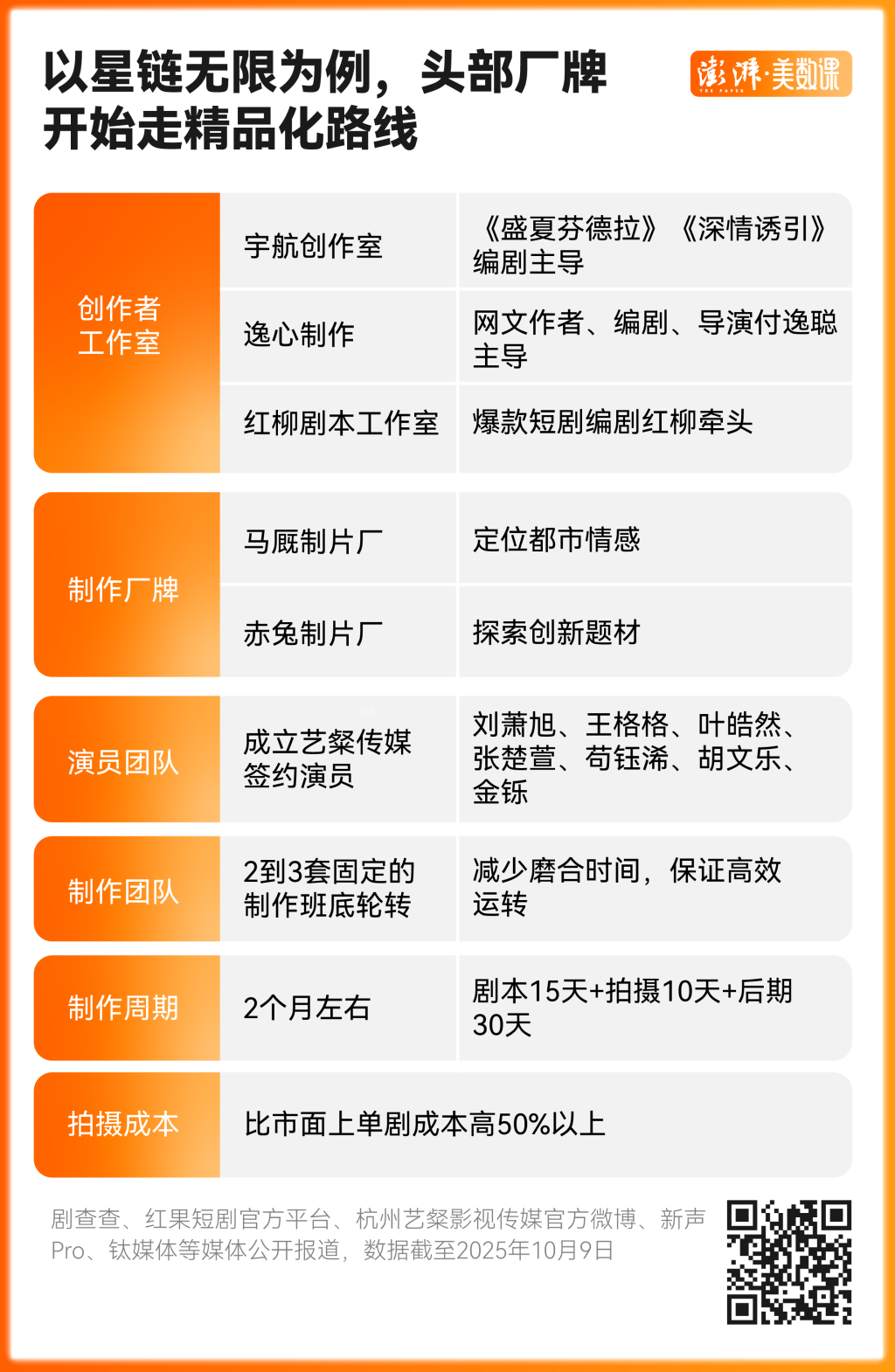 以马厩制片厂所在的星链无限为例,在内容制作环节,其借助创作者工作室、固定班底等模式,倾注更多的时间和成本打磨短剧细节,力求提升作品质感。
