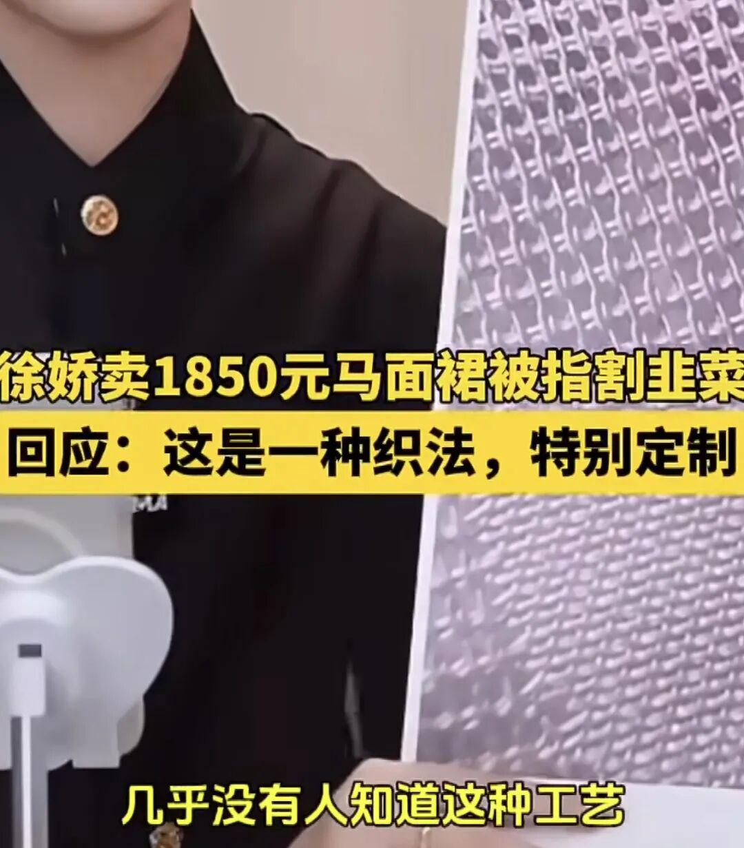 近日,徐娇重启汉服店,其中一款宣称“一人一版”的马面裙标价1850元,因宣传中强调“绫罗绸缎”“花罗”等传统材质,但商品详情页标注面料为100%聚酯纤维(化纤),引发网友质疑涉嫌虚假宣传。对此,徐娇回应:“罗”是一种织法,这次使用的罗是特别定制,国外很多大品牌也在使用,希望把这种中国传统织造工艺带回现代生活。