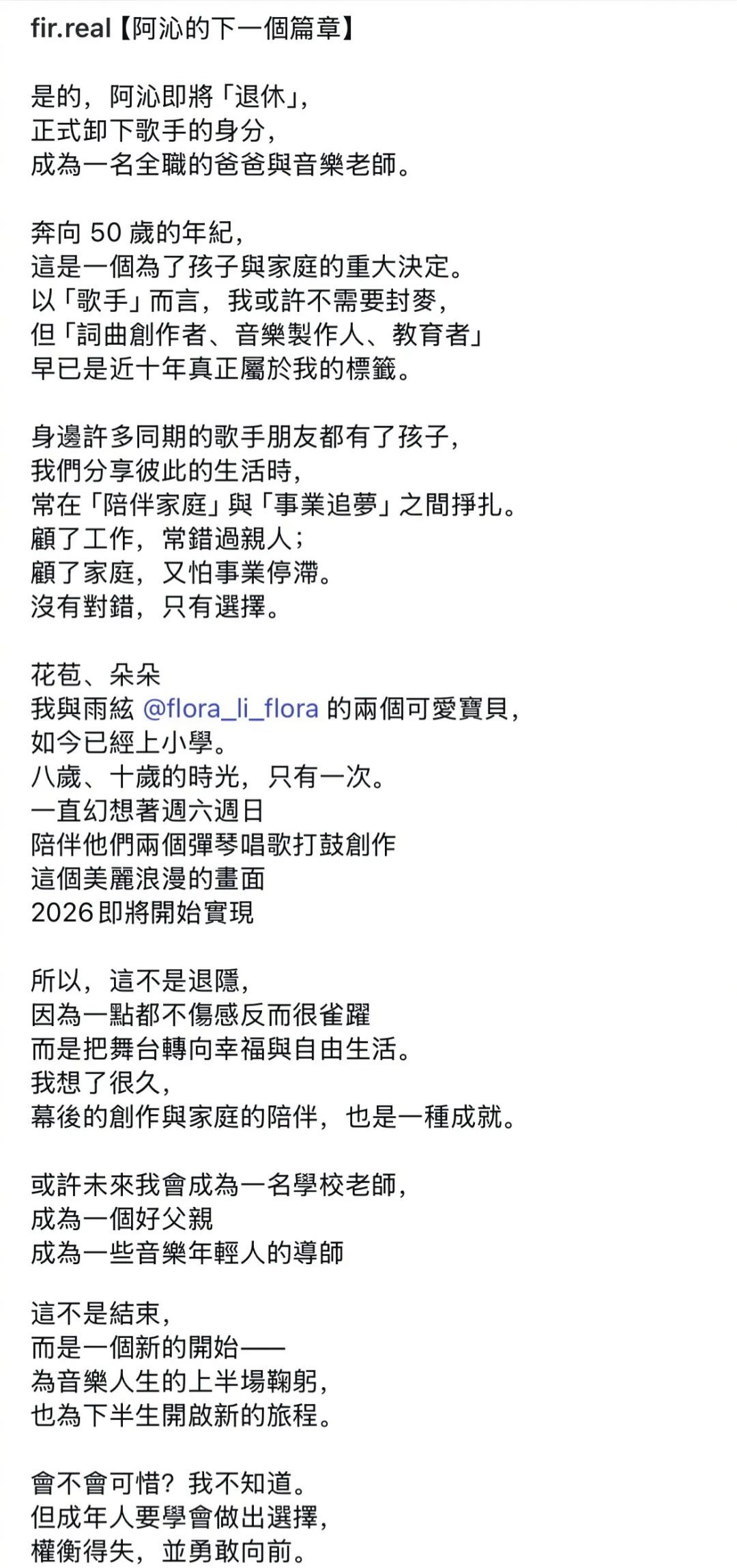 13日,飞儿乐团前成员阿沁无预警宣布退圈,表示自己将正式卸下歌手身份,成为一名全职爸爸和音乐老师,“这不是隐退,因为一点都不伤感反而很雀跃,而是把舞台转向幸福与自由生活。”据悉,2015年他与小14岁的模特女友宣布订婚,育有两女,2024年他离开飞儿乐团。