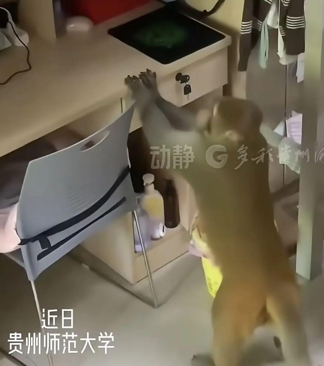 近日,贵州几所高校遇管理猿突击“查寝”,不但自然的翻箱倒柜,还随手拿起同学的水喝,网友:本学期新增《灵长类动物行为学》,上课地点:学生宿舍。