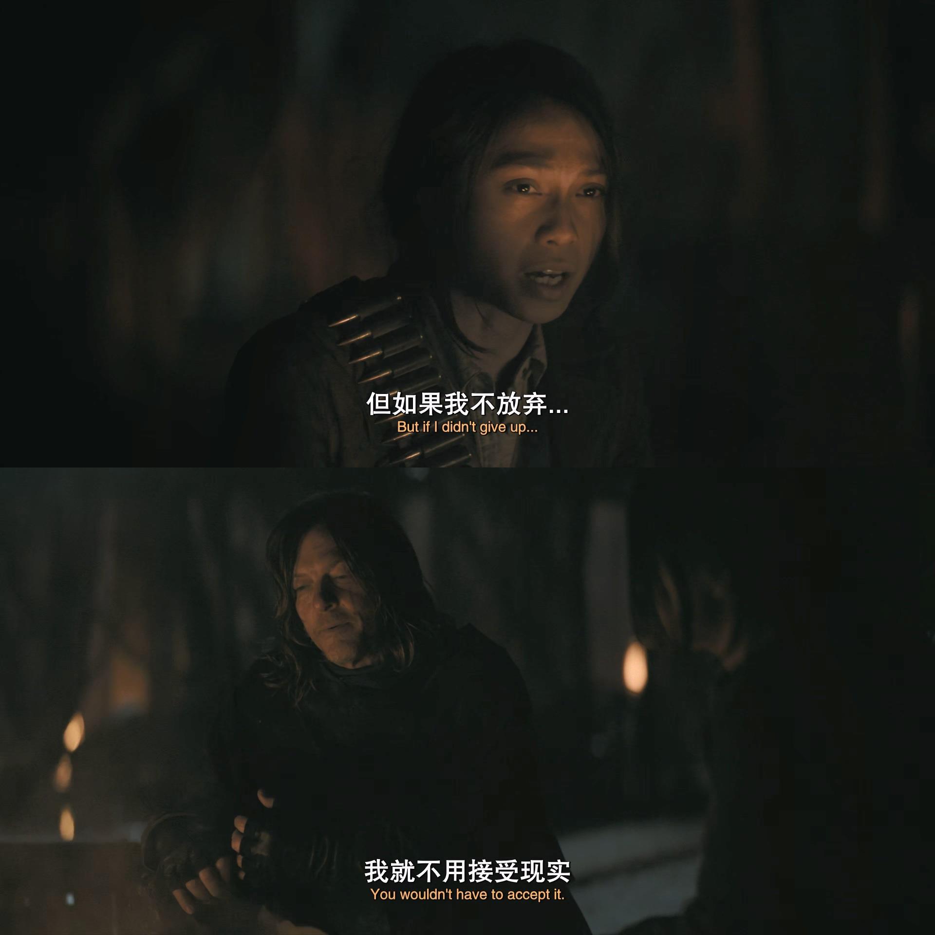对于帕兹的遗憾和决心,达里尔很理解,他自己也有着相同的经历(寻找瑞克),只要不放弃,那就不用接受“现实”,万一哪天奇迹真的出现了呢?