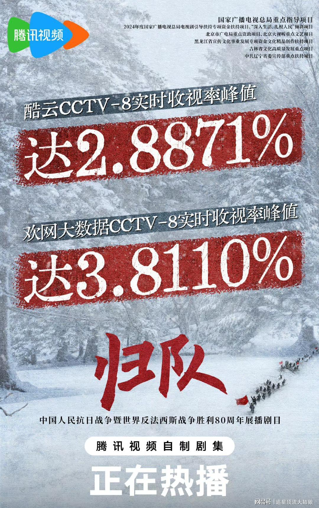 播出期间CCTV8收视峰值达2.8871%,登顶黄金时段全国收视冠军。腾讯站内热度峰值达25700+,猫眼热度值9577.70,豆瓣开分7.9,实现收视率、口碑双赢。