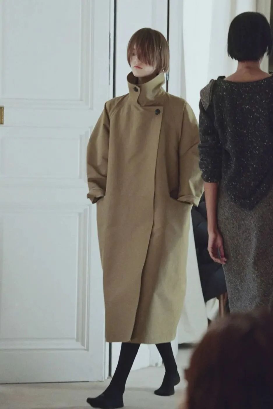 漏斗领作为风衣本身的一种设计元素,今年的存在感可以说是相当强。Saint Laurent将其演绎成锋利的雕塑线条,刚毅而挑衅;The Row用雕塑版的领口设计,彰显利落姿态。