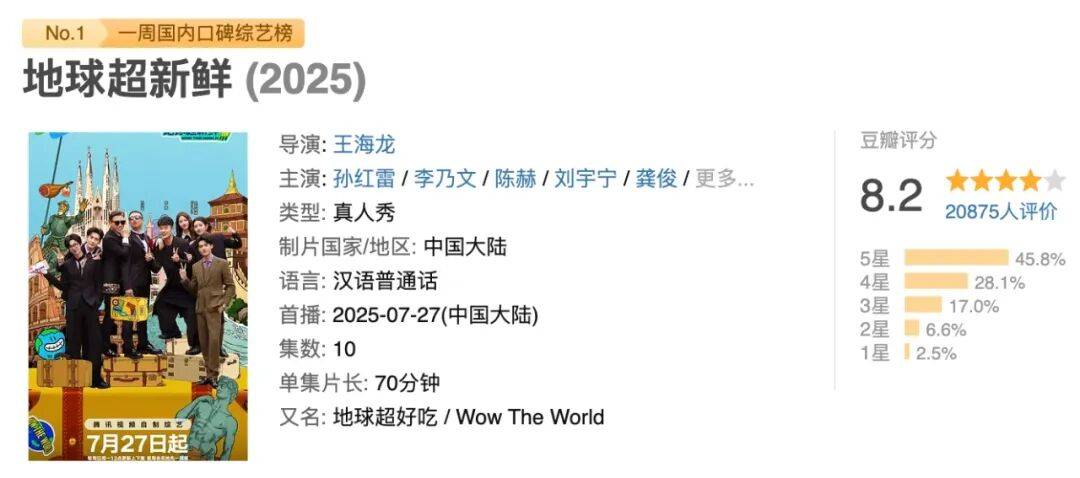 还有腾讯视频的《地球超新鲜》,最近该节目的豆瓣开分新鲜出炉,8.2的豆瓣评分足以证明这档“综一代”新节目很难得受到了相当数量观众的热烈追捧,而节目热播成功抬咖李乃文、王玉雯等艺人助其影综两栖发展的捧人功效,也昭示了明星耍宝式真人秀也并非很多人口中说得“一无是处”。