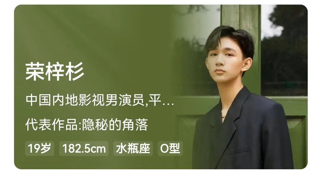 荣梓杉,2006年出生于四川省绵阳市。他因2015年参演贾樟柯导演的电影《山河故人》中童年张到乐一角正式踏入演艺圈,2020年凭借悬疑剧《隐秘的角落》中“朱朝阳”一角爆红,并斩获釜山国际电影节亚洲内容大奖“最佳新人男演员奖”。此后主演了《外太空的莫扎特》《你安全吗?》《大考》等多部热门影视作品,2024年以中央戏剧学院与北京电影学院表演专业“双料第一名”的成绩被中戏录取。