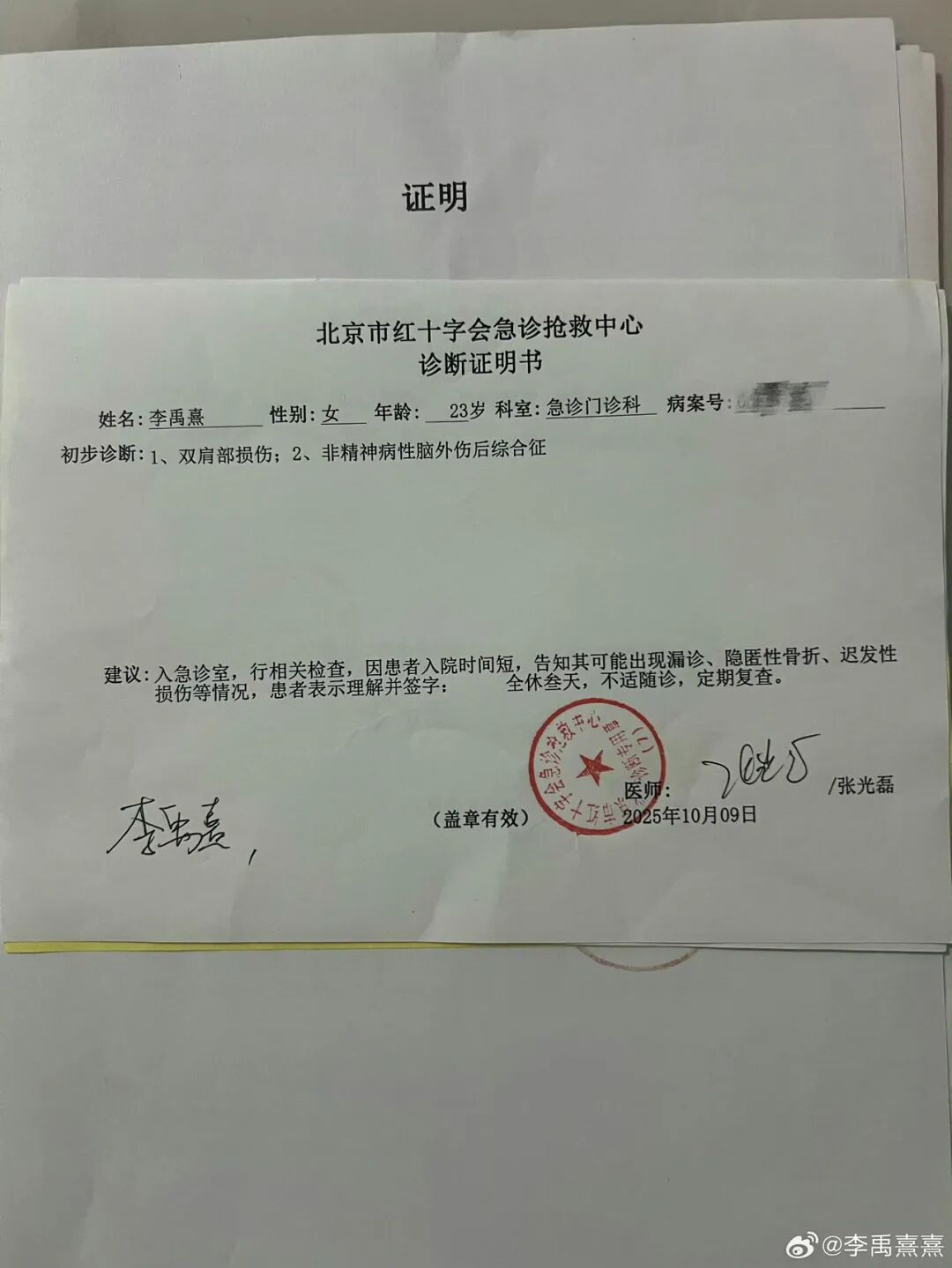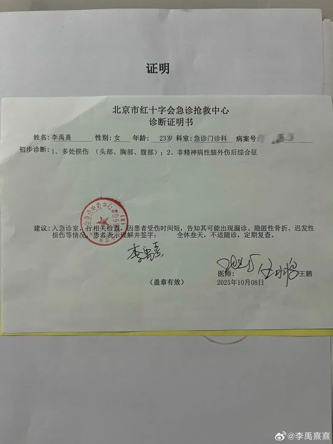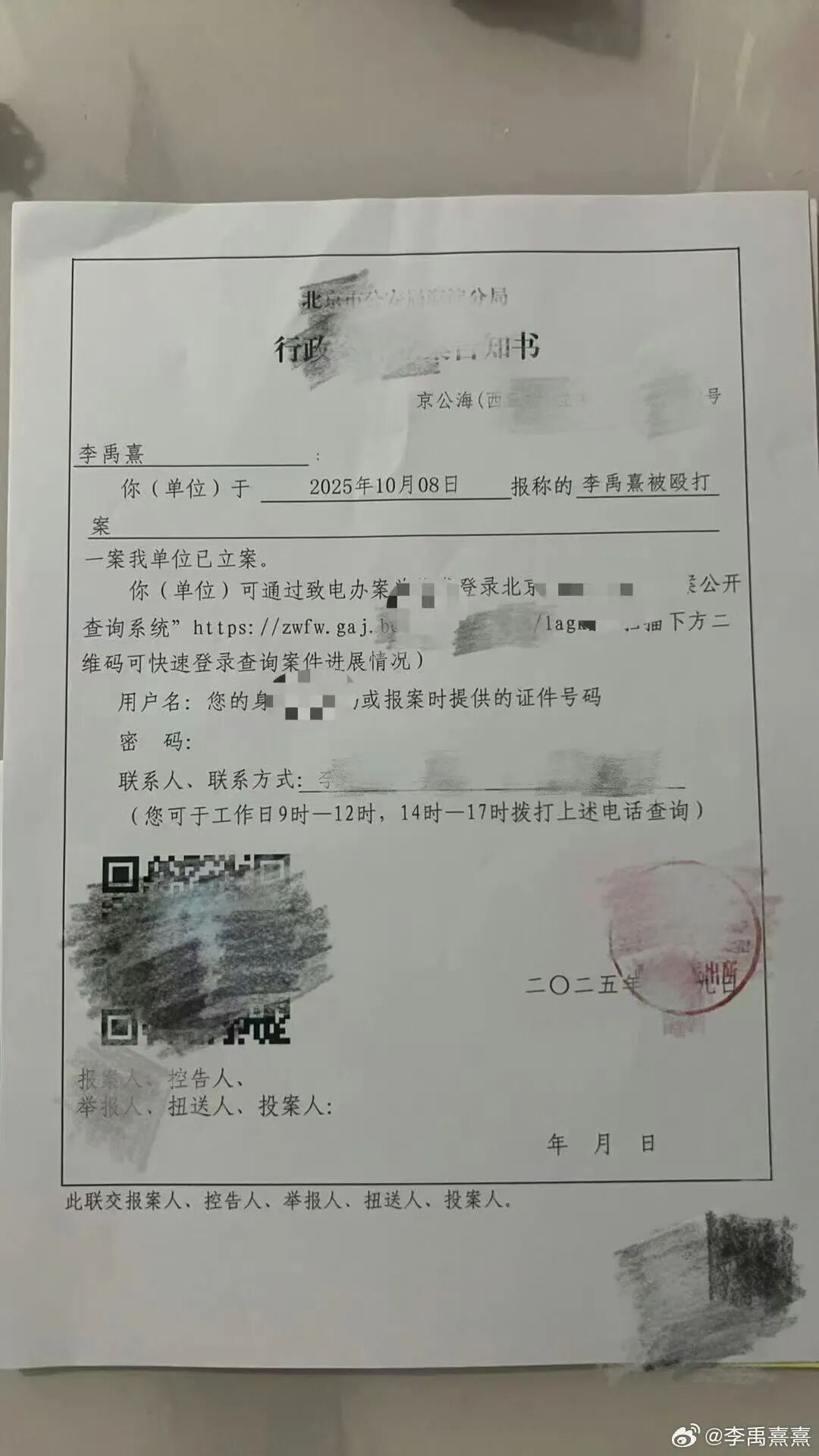 女生晒出的立案告知书和诊断证明: