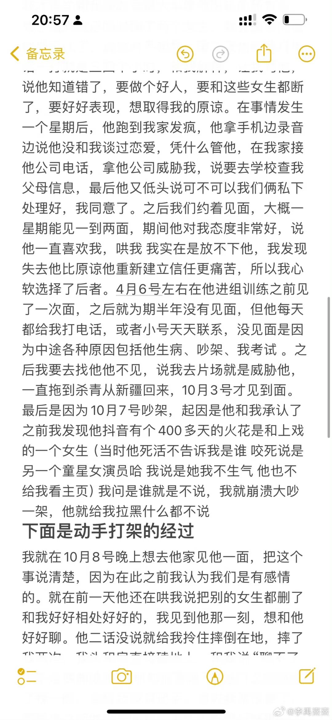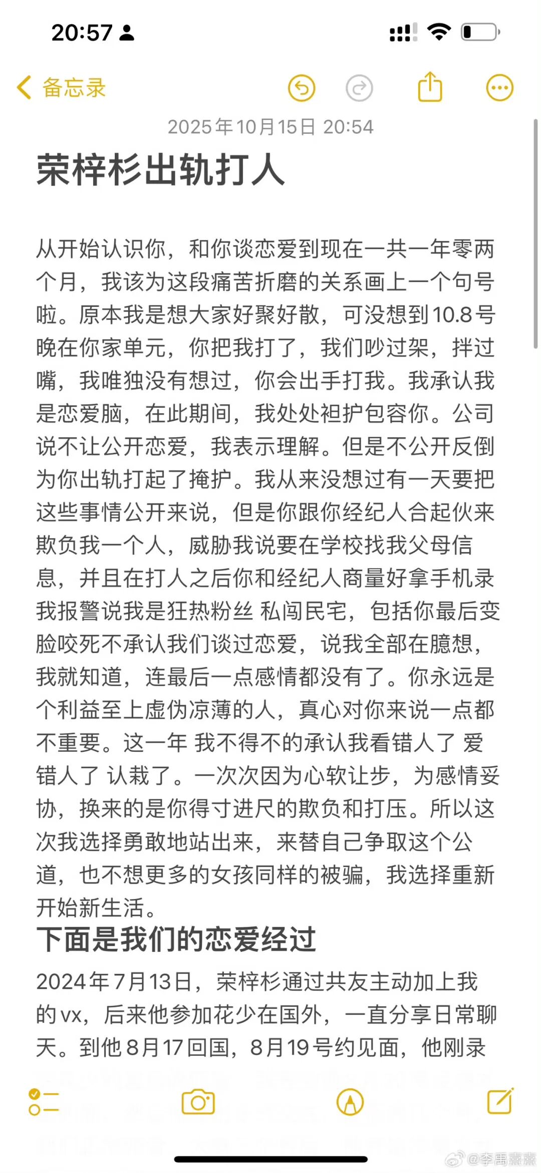 10月15日晚,新人演员李禹熹(中戏21表演本科班)发微博自爆和荣梓杉谈过恋爱,并指责其在恋爱期间出轨打人。