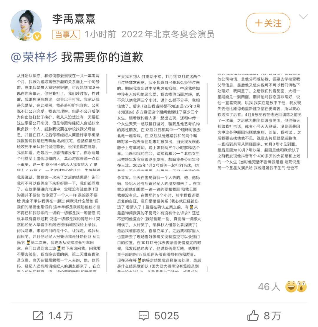 10月15日晚,新人演员李禹熹发博自爆和荣梓杉谈过恋爱,并指责其在恋爱期间出轨打人,现在喊话荣梓杉道歉。