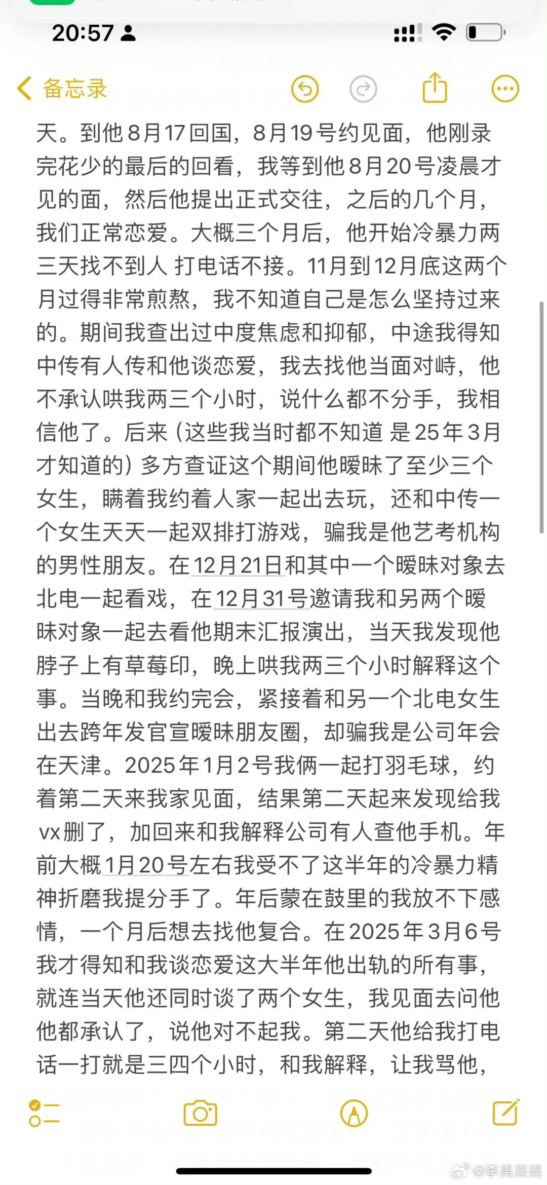 2025.3.6得知他出轨的所有事,同时谈了两个女生,在女生的质问之下,承认并且道歉了;