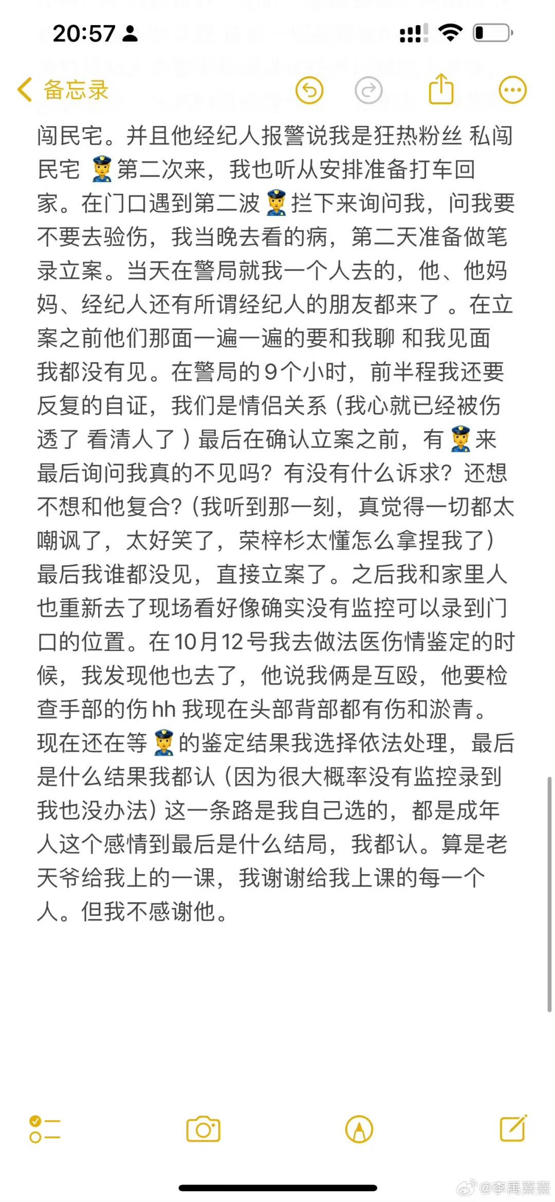 第二次到警察局做笔录的时候,荣梓杉、荣梓杉妈妈、荣梓杉经纪人还有经纪人的朋友都在场,不断提出要和李禹熹聊聊。确认立案前还有警察来问李禹熹询问“真的不见吗?有没有什么诉求?还想不想复合?”