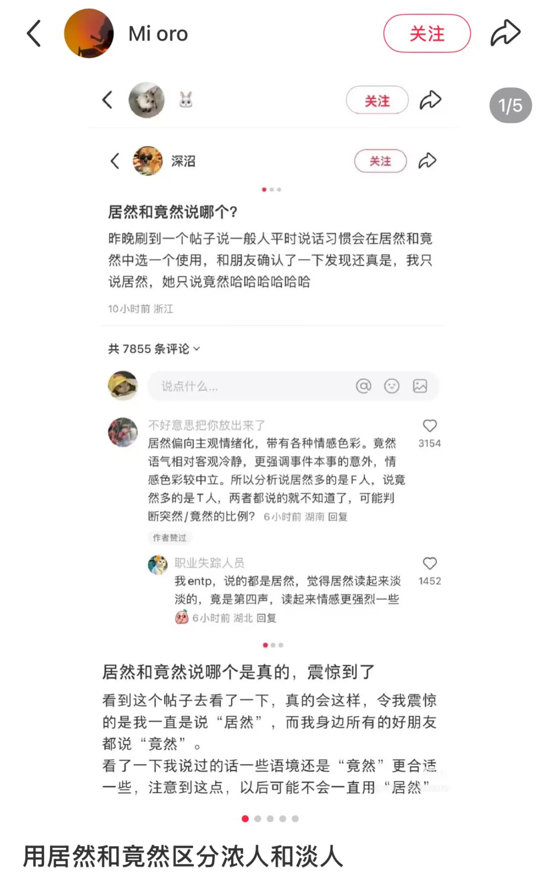 很多人意识到,自己在表达“出乎意料”时,会不自觉地被“居然”或“竟然”中的一个“垄断”,于是便划分为“居然人”与“竟然人”。少数两者混用者,则自称“居竟人”或“混然人”。