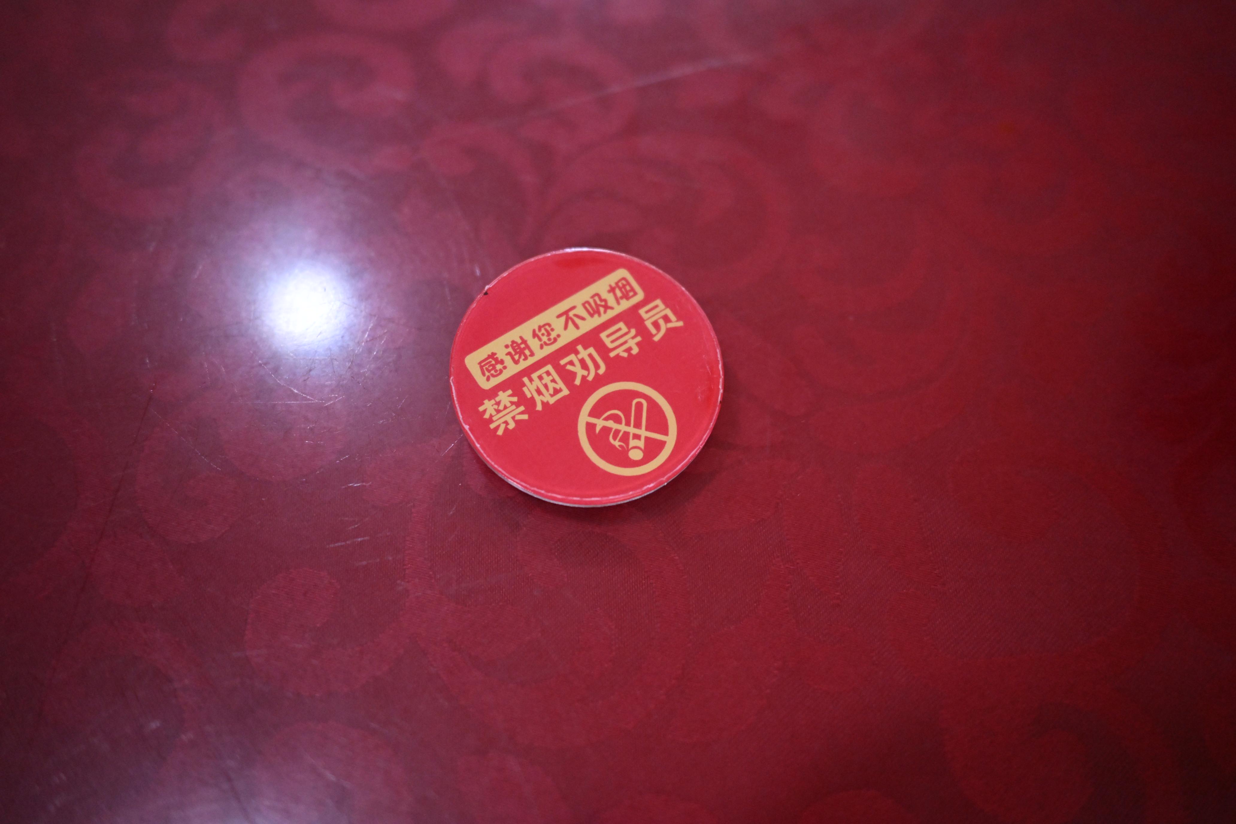 身旁服务员的围裙上,别着“禁烟劝导员”的红色胸牌。等你点完餐,对方还会告知一句“咱家店里不能抽烟哈”。没想到小小一家餐馆,能把禁烟做得这么有仪式感。