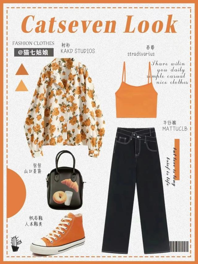 鞋子选择橘色或黑色都是可以的,反正相同色系总不会错~