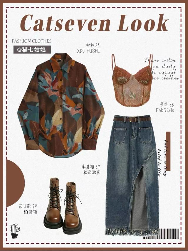 棕色吊带鱼骨衫+牛仔开叉半裙,上短下长,把腰线突出来嘎嘎显高。