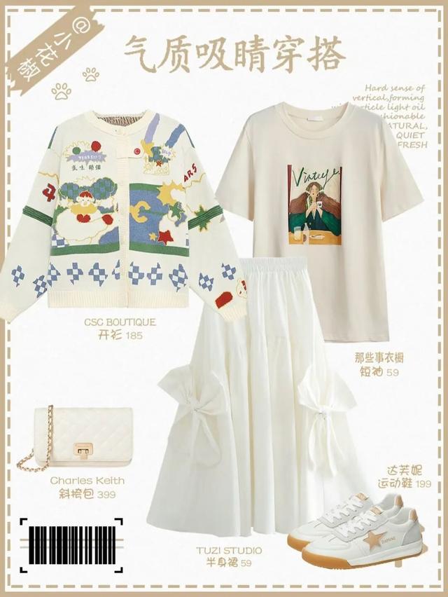 米色印花T恤搭配白色立体花花半裙,一整身浅色系永远百搭不易错。