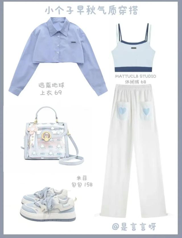 真心建议大家要试试蓝白配,蓝色吊带+白色卫裤清爽亮眼,洋溢着属于秋冬的少女感。