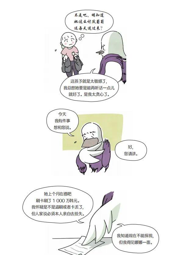 书中分享到一件事情,护士郑诗娜去理发,仅仅因为“不想看起来像是个没钱的人,不想起争执”就被迫花了35万韩元。妄想者小松鼠觉得她偷了自己的3000万韩元,才有钱去做头发,因而两人总是起争执。