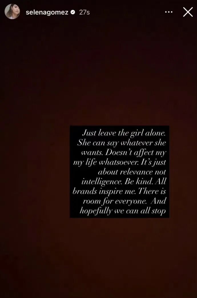 近日,海莉Hailey Bieber在采访中被问及赛琳娜Selena Gomez,她说自己不喜欢被拿来和任何人比较:“我不会对那些无法给我启发的人产生竞争感。”对此,赛琳娜ins回应:“别管她了,她想说什么就说什么吧”,“友善一点,希望我们都能停下来。”