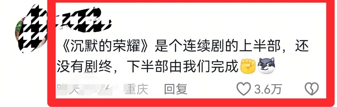 更有网友认为,“《沉默的荣耀》是个连续剧的上半部,还没有剧终,下半部由我们完成”。