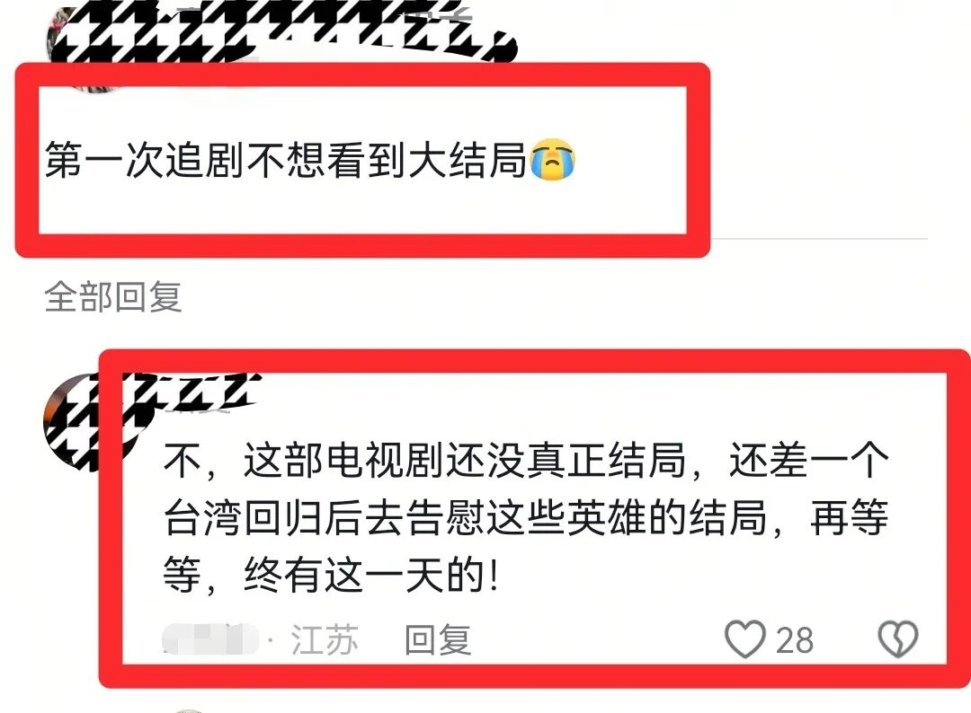 但有网友却觉得,“不,这部电视剧还没真正结局,还差一个湾湾回归后去告慰这些英雄的结局,再等等,终有这一天的!”