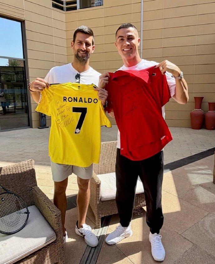 C罗在社交媒体上晒出自己与德约科维奇的合照,两人互换了to签球衣。