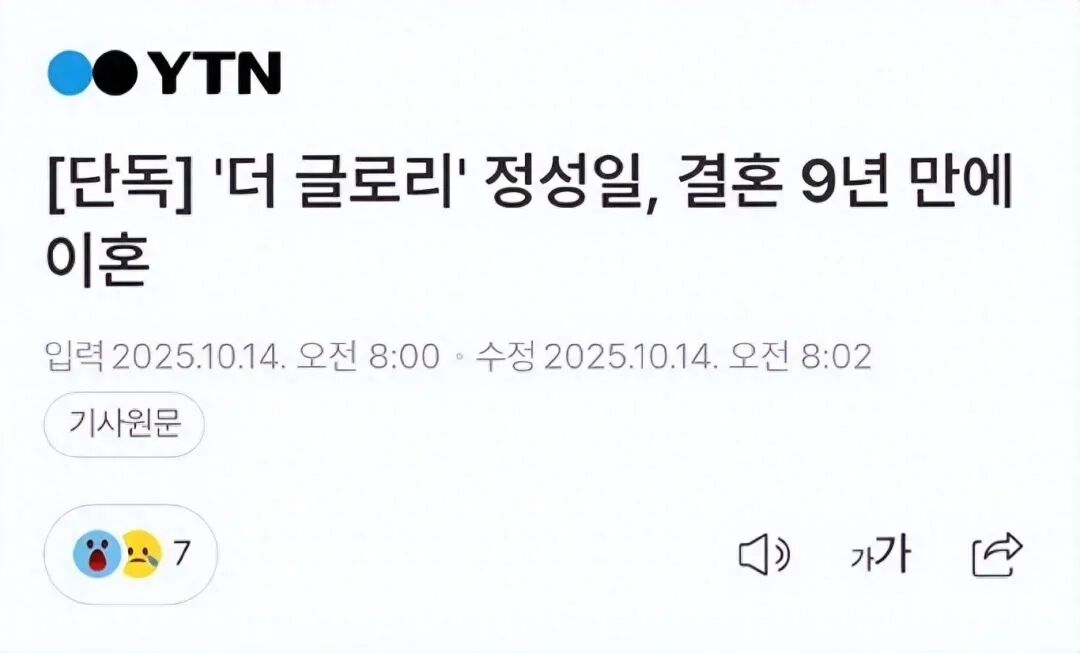 凭借《黑暗荣耀》爆红的郑成日,宣布与结婚9年的妻子离婚。