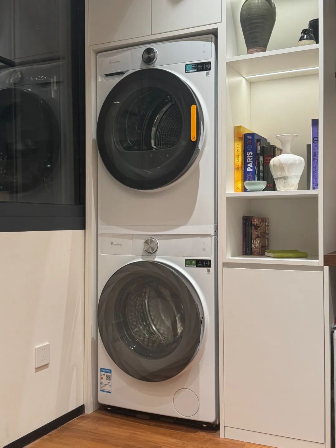 后来就下定决心,买洗衣机一定要配一台烘干机,洗烘套装可以叠放,完全不占多少空间。