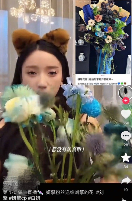 继续深扒,有粉丝发现白妍直播时说自己做了插花,用的花和刘擎新剧开机仪式上粉丝送的花一模一样。