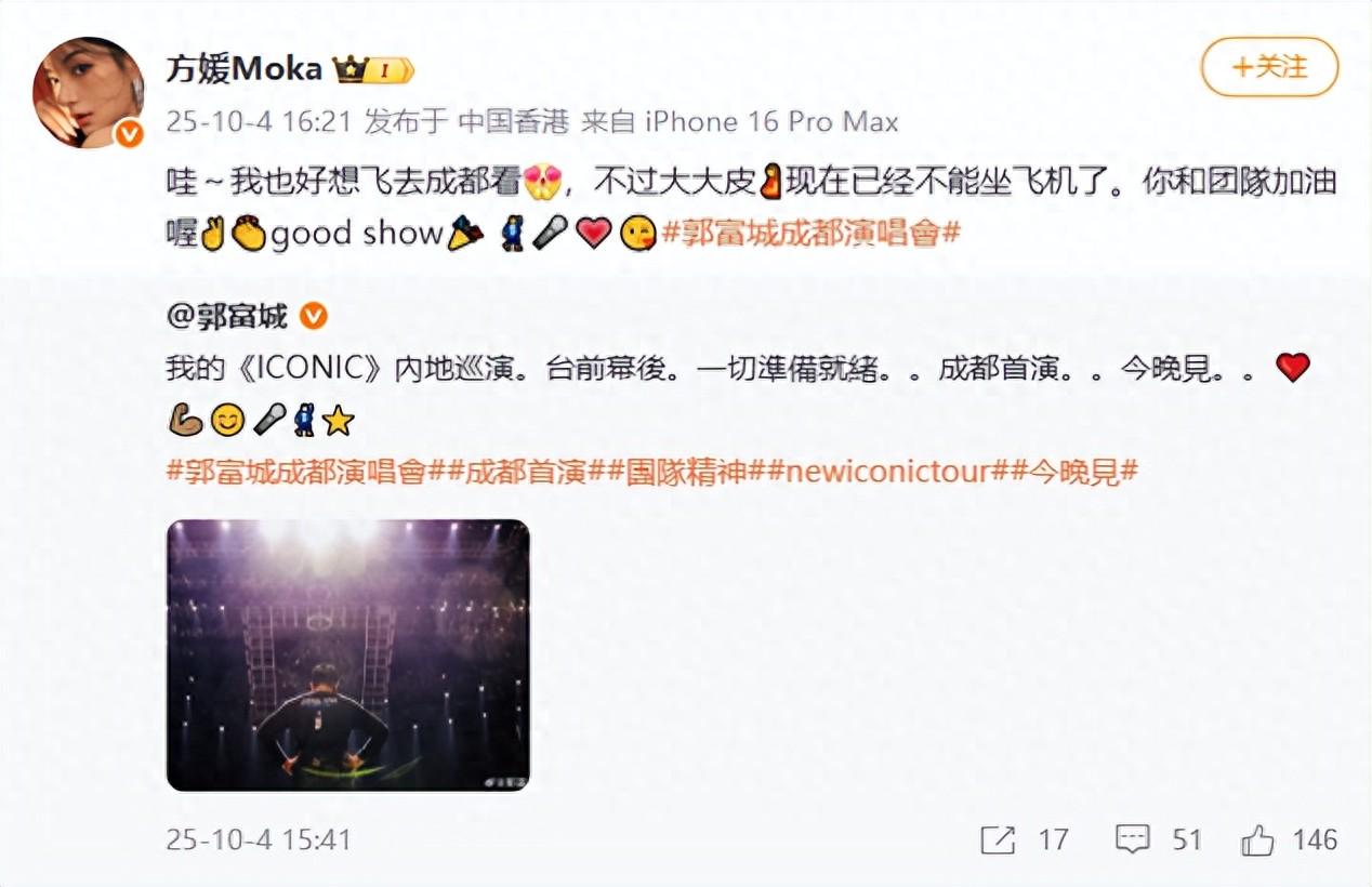 10月4日,方媛发文说她很想去成都看郭富城的演唱会,但是因为大肚子无法坐飞机。