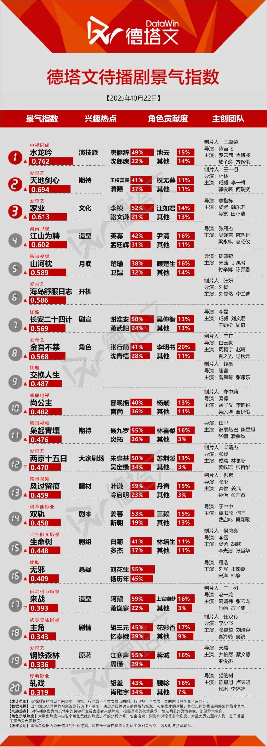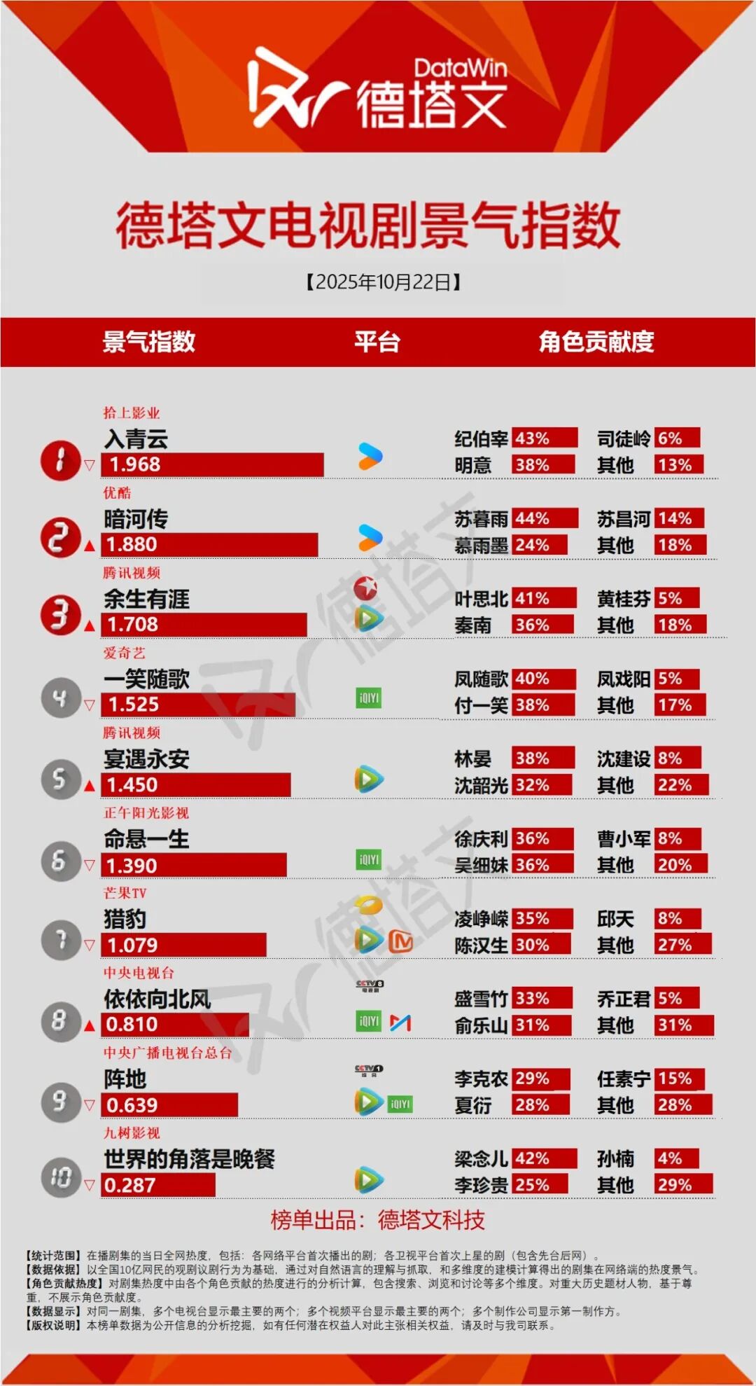 古装武侠剧《暗河传》于10月20日在优酷独家上线,当前最高景气指数1.880,快速进入头部序列。该剧以“少年歌行宇宙”IP为依托,首播市场反响稳健,竞争势态强劲。