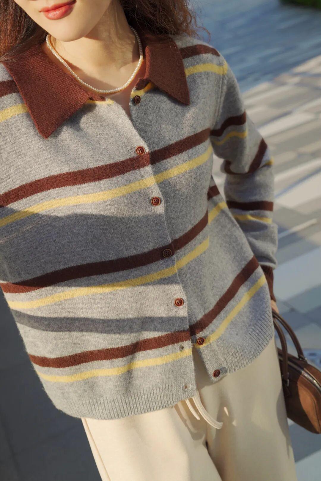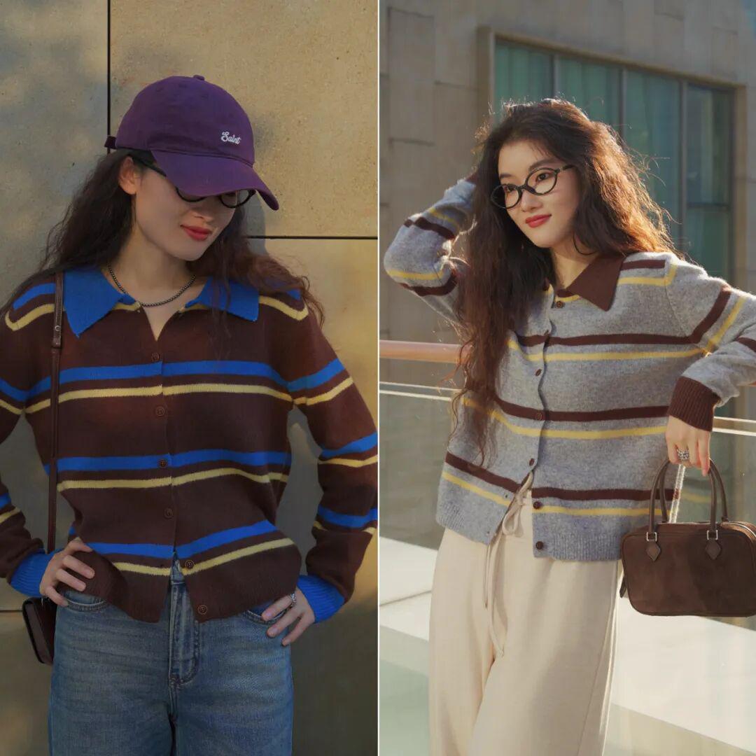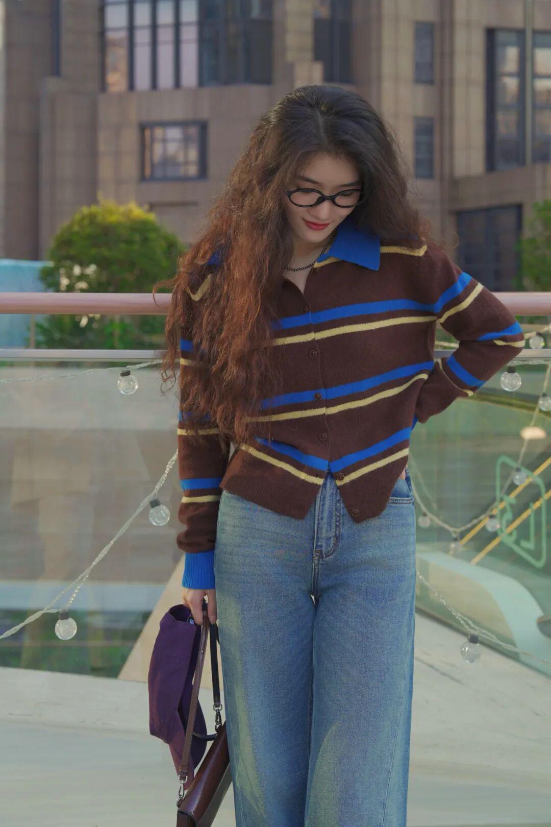 棕蓝黄条纹,颜色看似浓郁但一点也不沉闷。告诉你们哦,这个蓝色我们对比过色卡,选的是超显白的藏蓝调!日常配一条简单的牛仔裤都很出众了。