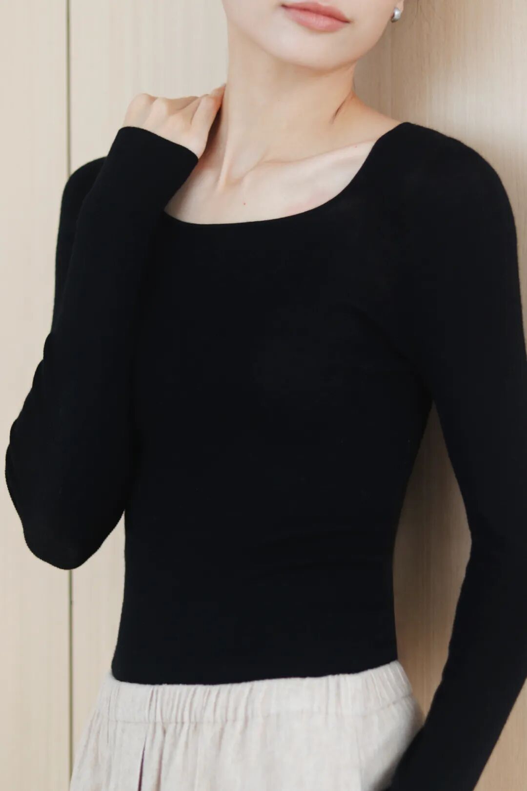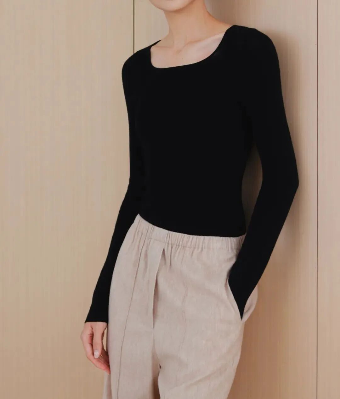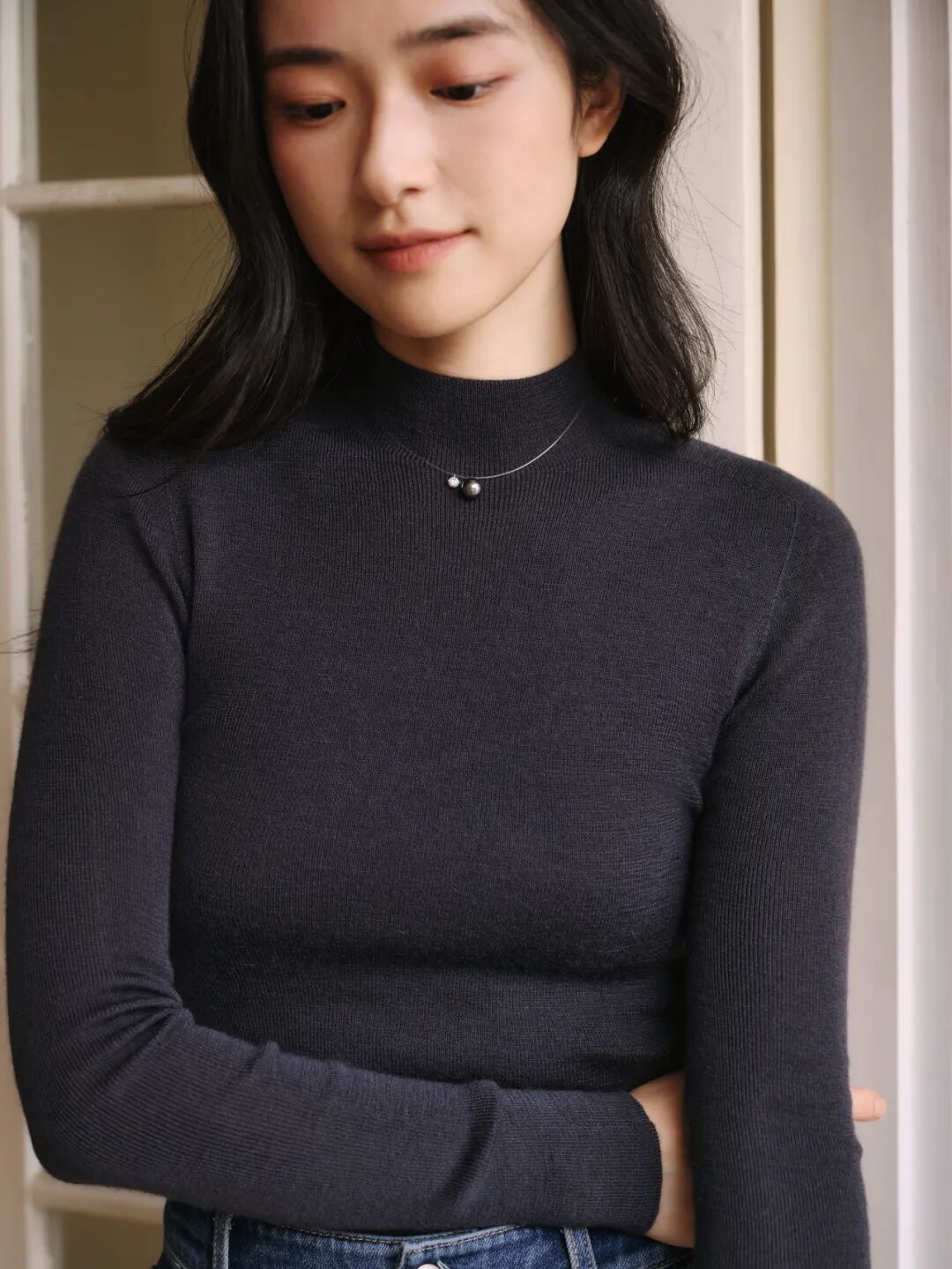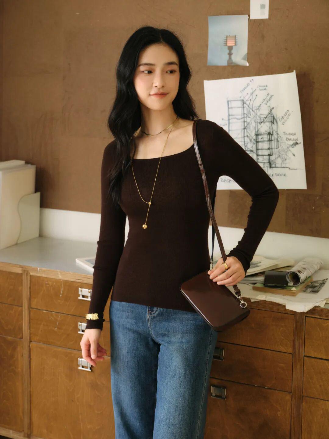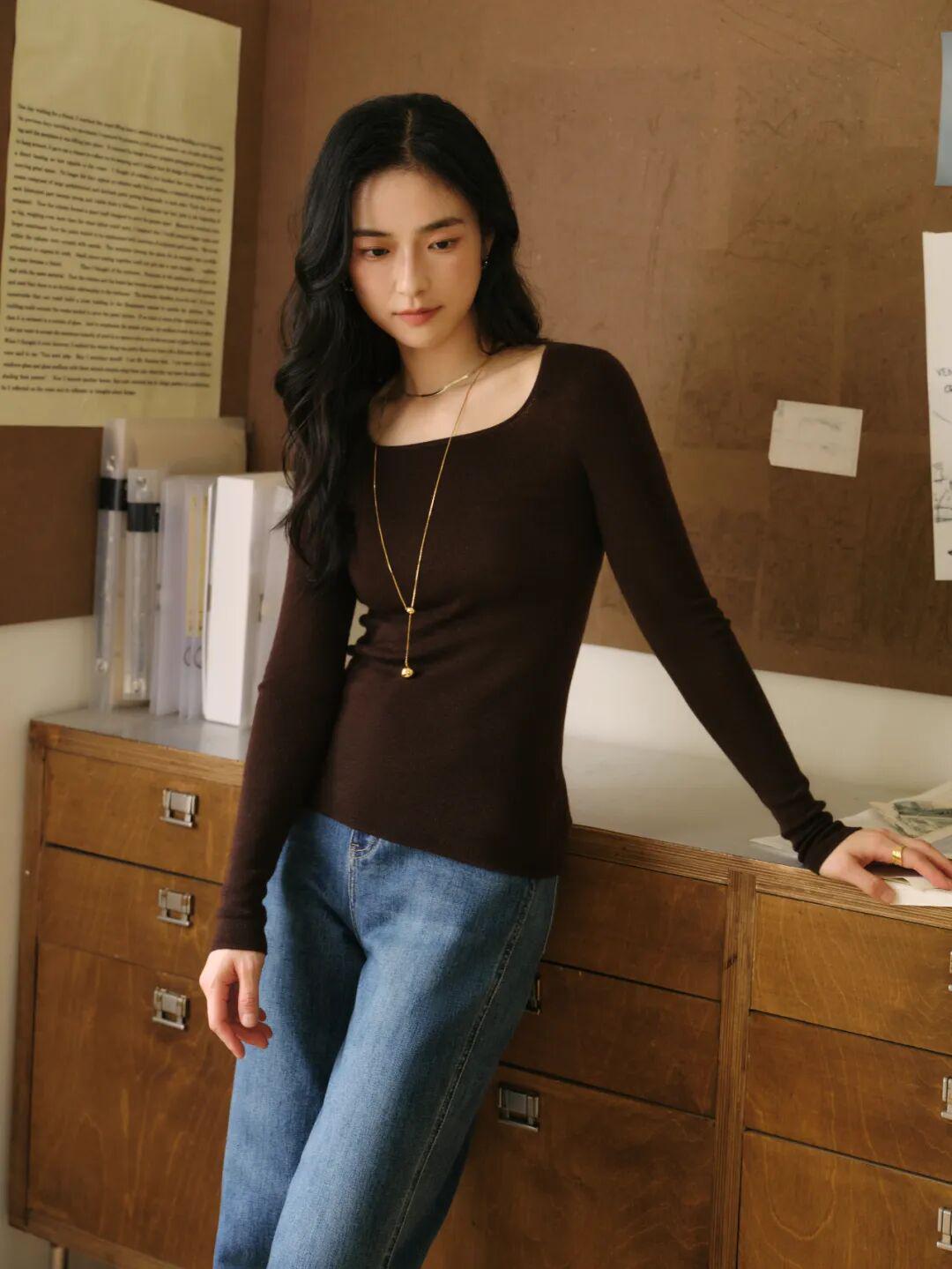 如果你不喜欢有领的,我们还出了一款方领的打底衫,用的也是扬子美丽诺羊毛,但是支数更高,足足有60支!