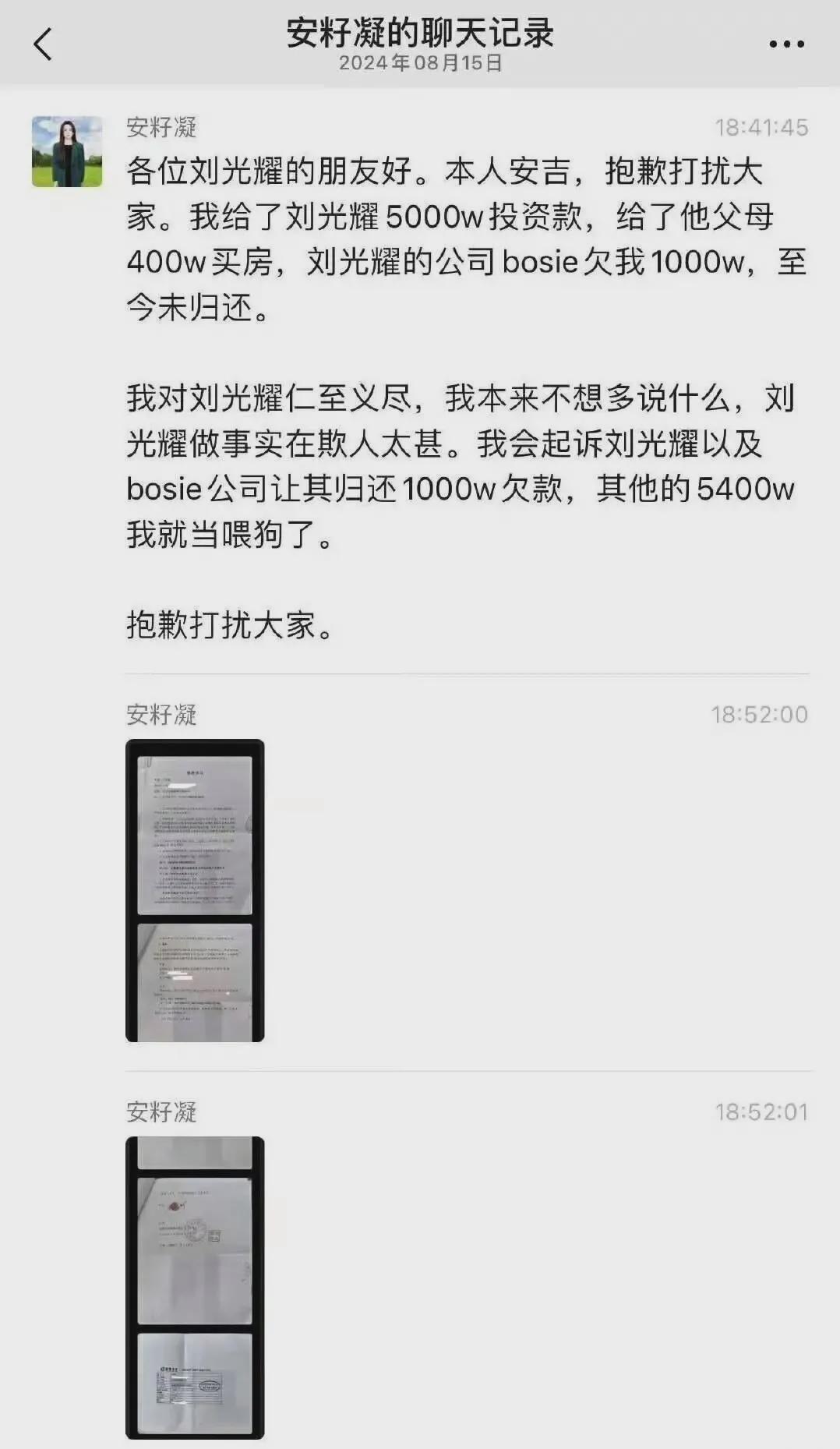 “我给了刘光耀5000万投资款,给了他父母400万买房,刘光耀的公司欠我1000万,我会起诉刘光耀及其公司让其归还1000万欠款,其余5400万,我当喂了狗。”