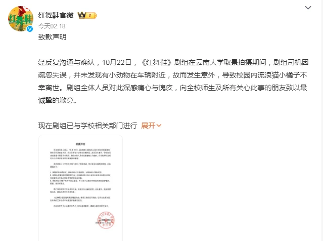 现在剧方给出的处理方式是“司机辞职”,这显然很难平息广大网友的怒火,尤其是对于云南大学的学生,小猫的存在已经成为了他们生活中的一部分,这条小生命真的是学生们用爱心造就的,如今居然因为《红舞鞋》的剧组人员在学校人行道开快车而被撞死,真的是让人意难平,剧组去学校取景,怎么会如此嚣张,不知道在高傲什么。