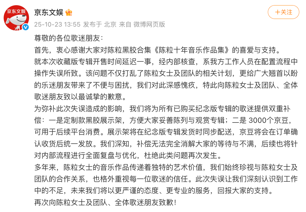 10月23日,@京东文娱 发文称,衷心感谢大家对陈粒黑胶合集《陈粒十年音乐作品集》的喜爱与支持。就本次收藏版专辑开售时间延迟一事,经内部核查,系我方工作人员在配置流程中操作失误所致。该问题不仅打乱了陈粒女士及团队的相关计划,更给广大翘首以盼的乐迷朋友带来了不便与困扰,我们对此深感愧疚,特此向陈粒女士及团队、全体歌迷朋友致以最诚挚的歉意。为弥补此次失误造成的影响,我们将为所有已购买纪念版专辑的歌迷提供双重补偿。