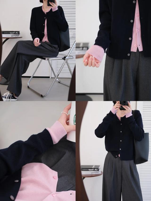 和普通开衫不一样的是,它用了28%羊毛混纺细纱线!前片双层手工套口工艺,复杂到成本直接飙升,但手感软糯到贴身穿都不扎,像被云朵裹住~