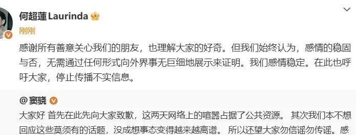 23日,窦骁回应近期网上热议的自己与何超蓮闹离婚等传闻,“我们本不想回应这些莫须有的话题,没成想事态变得越来越离谱”,希望大家勿信谣勿传谣。何超莲转发表示感情的稳固与否,无需通过任何形式向外界事无巨细地展示来证明,“我们感情稳定。”
