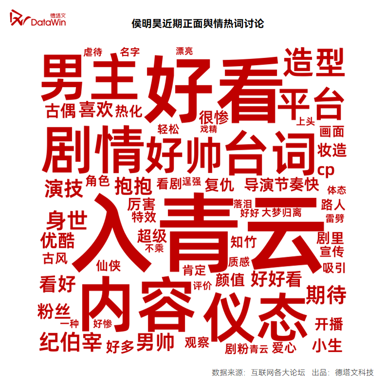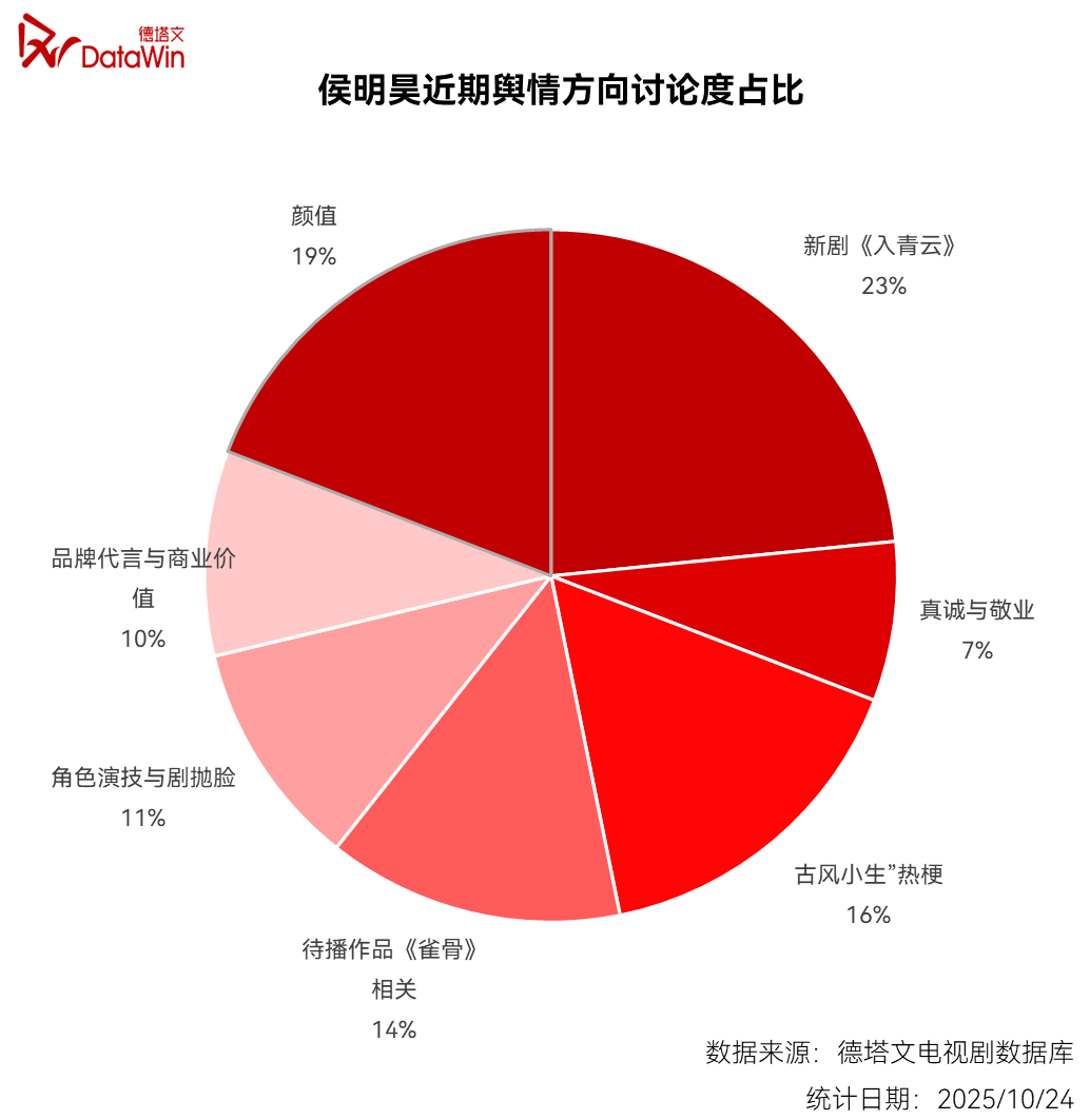 接下来,已在古装赛道稳固基本盘的侯明昊选择追求更高的突破,待播作品包括古装爱情剧《玉茗茶骨》《雀骨》,古装玄幻剧《逍遥》等。因此,在侯明昊近期舆情方向讨论中,新剧《入青云》、颜值、古风小生热梗、待播作品《雀骨》相关、角色演技与剧抛脸、品牌代言与商业价值成为观众主要探讨方向。