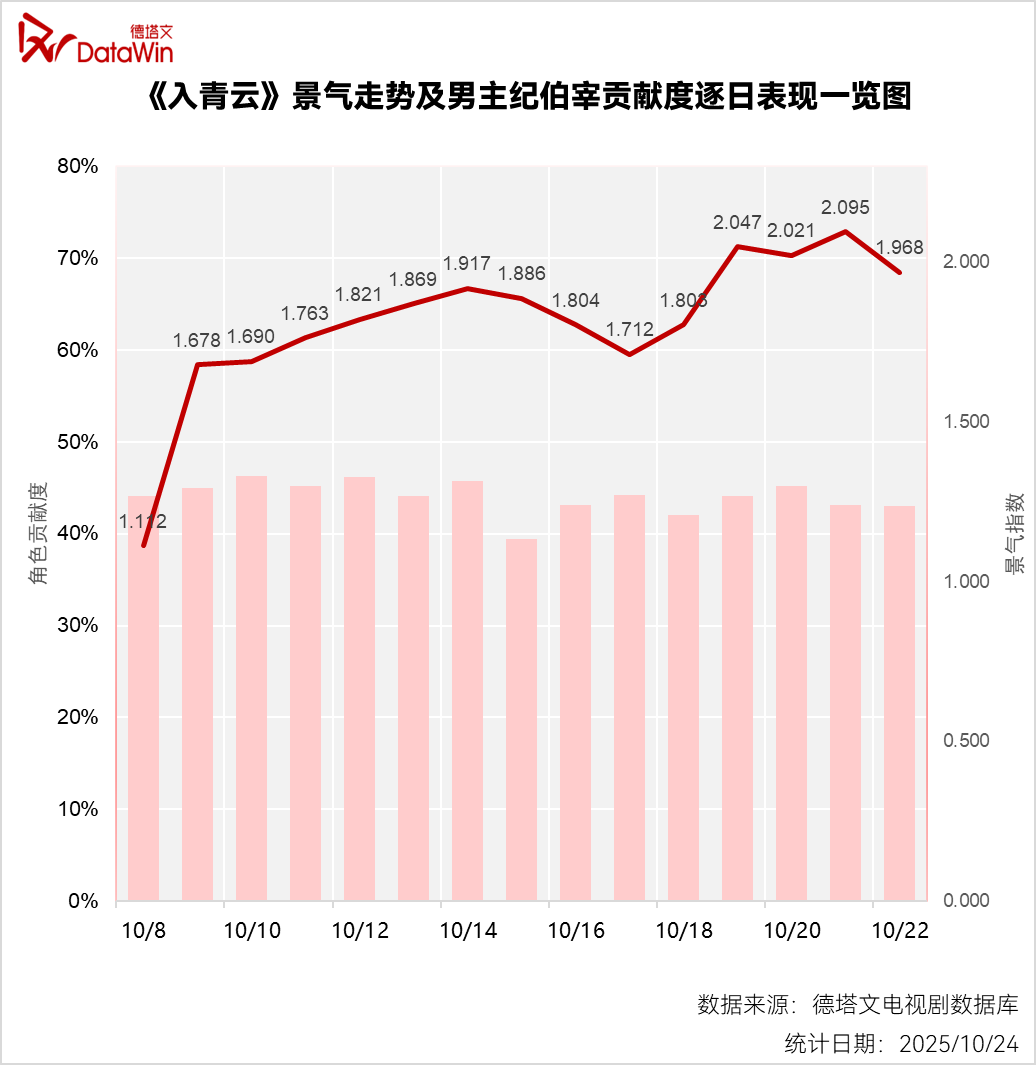 在景气指数、站内热度表现突出之外,《入青云》全网实时热度也在不断上升,目前全网曝光已超80.94亿,观众评价也呈现口碑爆棚态势。其中,纪伯宰相关话题同样表现抢眼。根据德塔文数据监测显示,剧集播出初期,该剧景气指数与男主纪伯宰的角色贡献度呈同步上升趋势,角色贡献度最高超过46%。
