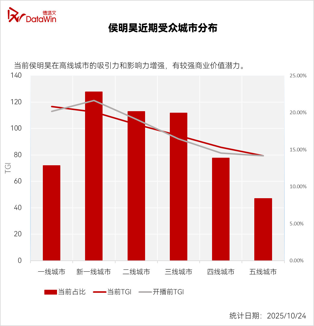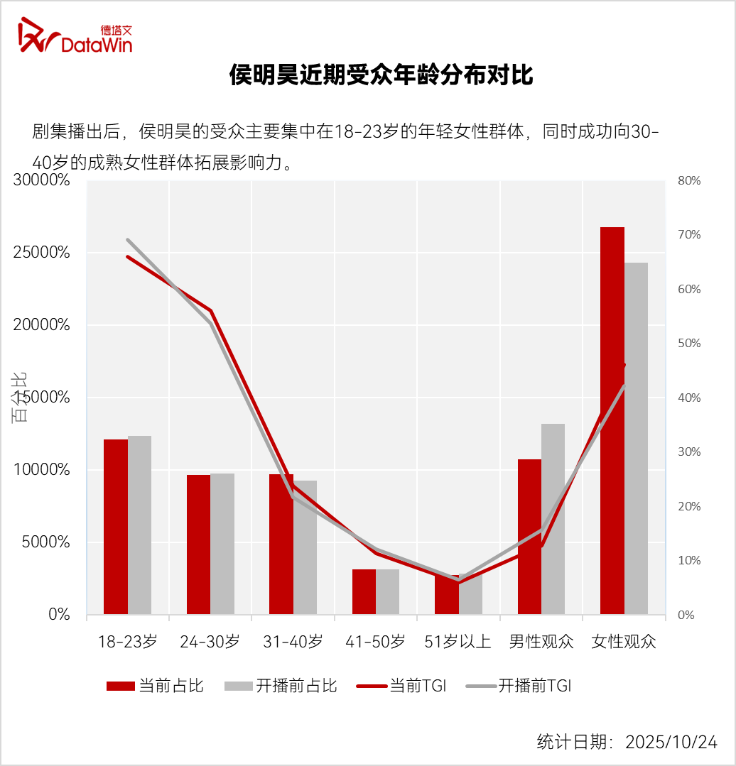 凭借纪伯宰这一“美强惨”角色的成功塑造,侯明昊在剧集播出后的女性受众占比提升,佐证了角色演绎精准击中了古装剧核心受众群体。同时,其在高线城市的吸引力和影响力增强,一线及新一线城市观众占比超35%,商业价值潜力不言而喻。