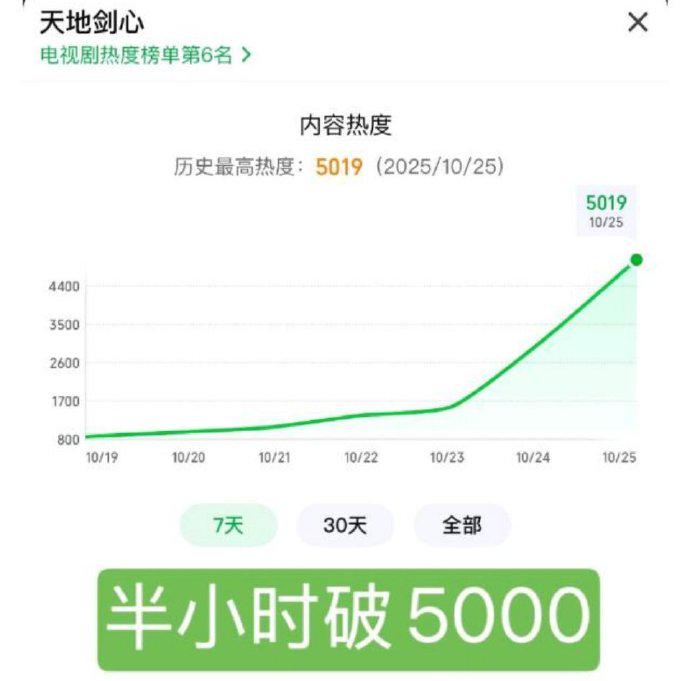 12点正式开播后,热度曲线直接 “垂直起飞”:30分钟内突破5000,1.5小时飙至6000,一举打破成毅此前《赴山海》保持的最快破6000纪录,到14:30热度已高达6522,稳坐同期剧集榜首。
