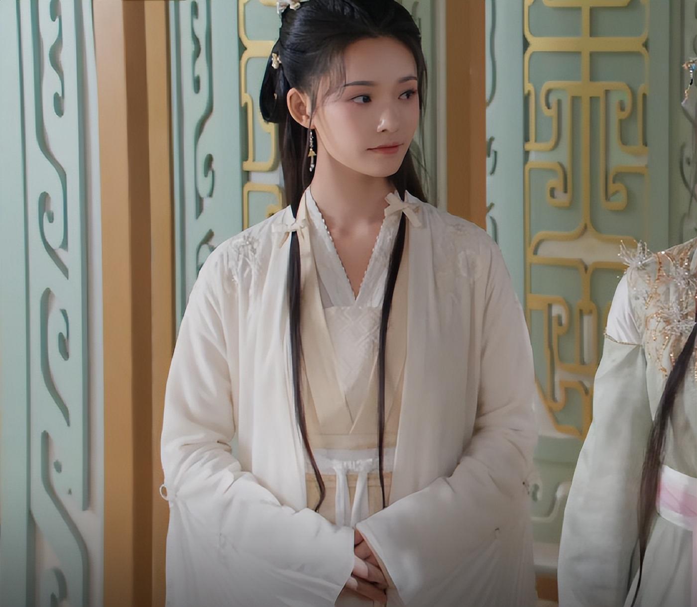 林允在剧中的妆造比不上其他角色繁复,但简练的发型和素色的衣衫反倒更显出清新脱俗。
