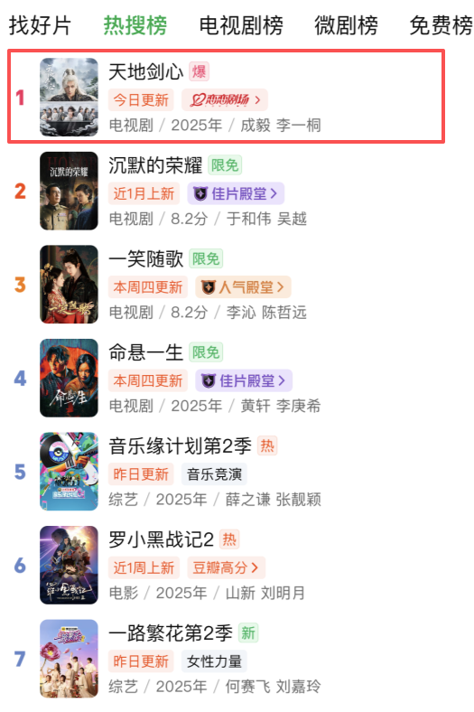 《天地剑心》上线桃厂,首播仅2小时便拿下站内热榜第一,热度轻松破6500,成绩势如破竹。